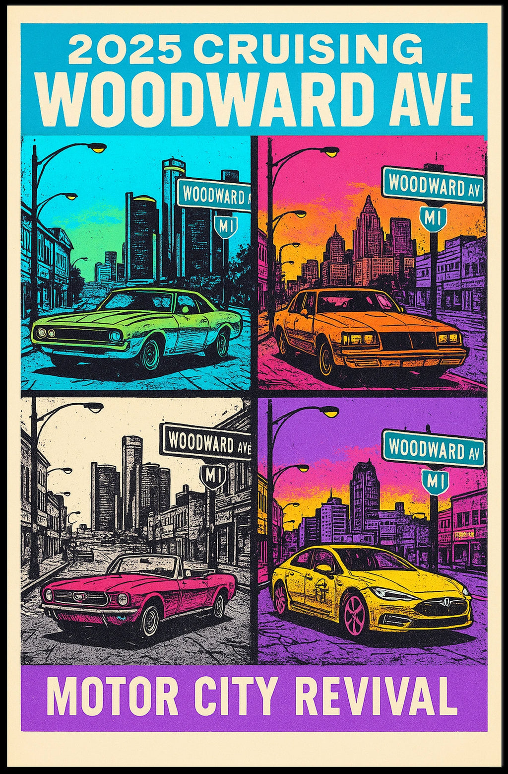 Brighten up any room with the 2025 Cruising Woodward Ave Poster. This art print brings a casual, wanderlust vibe to your walls thanks to its Transportation and Urban Life energy, mixed with Vintage Ads and Travel & Places flair. With retro 80s and Art Deco influences, it fits a variety of spaces—from living rooms to home offices to hallways. Measuring 18x24 inches, it’s a versatile size that frames easily and suits many styles.