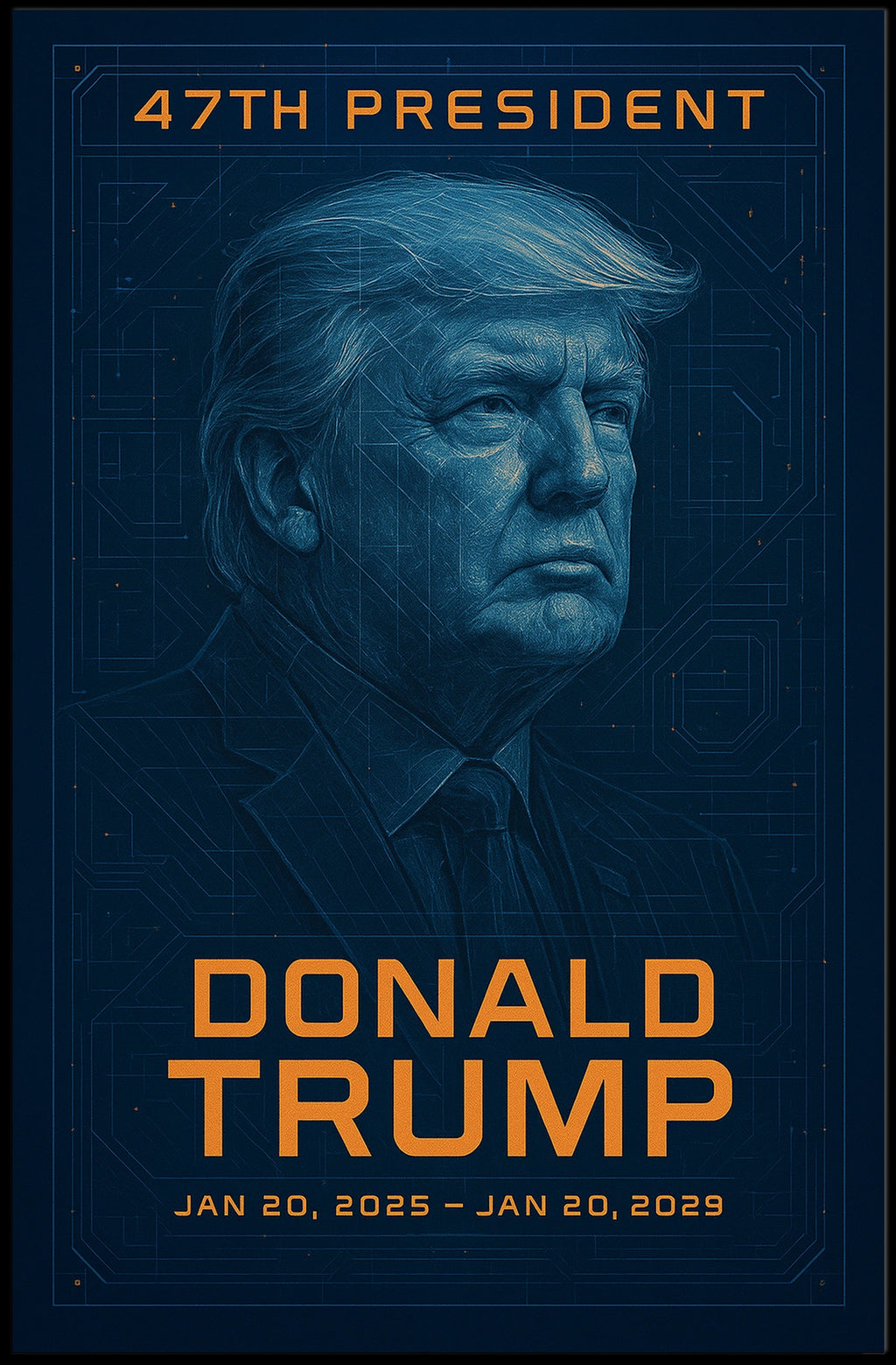 Rendered in a futuristic blueprint style, this art print portrays Donald Trump as a visionary leader. The intricate circuit-like patterns in the dark backdrop symbolize connectivity and progress, echoing his tenure from January 20, 2025, to January 20, 2029. The powerful cool color scheme and decisive posture convey resilience and determination, making it a striking centerpiece for any room.