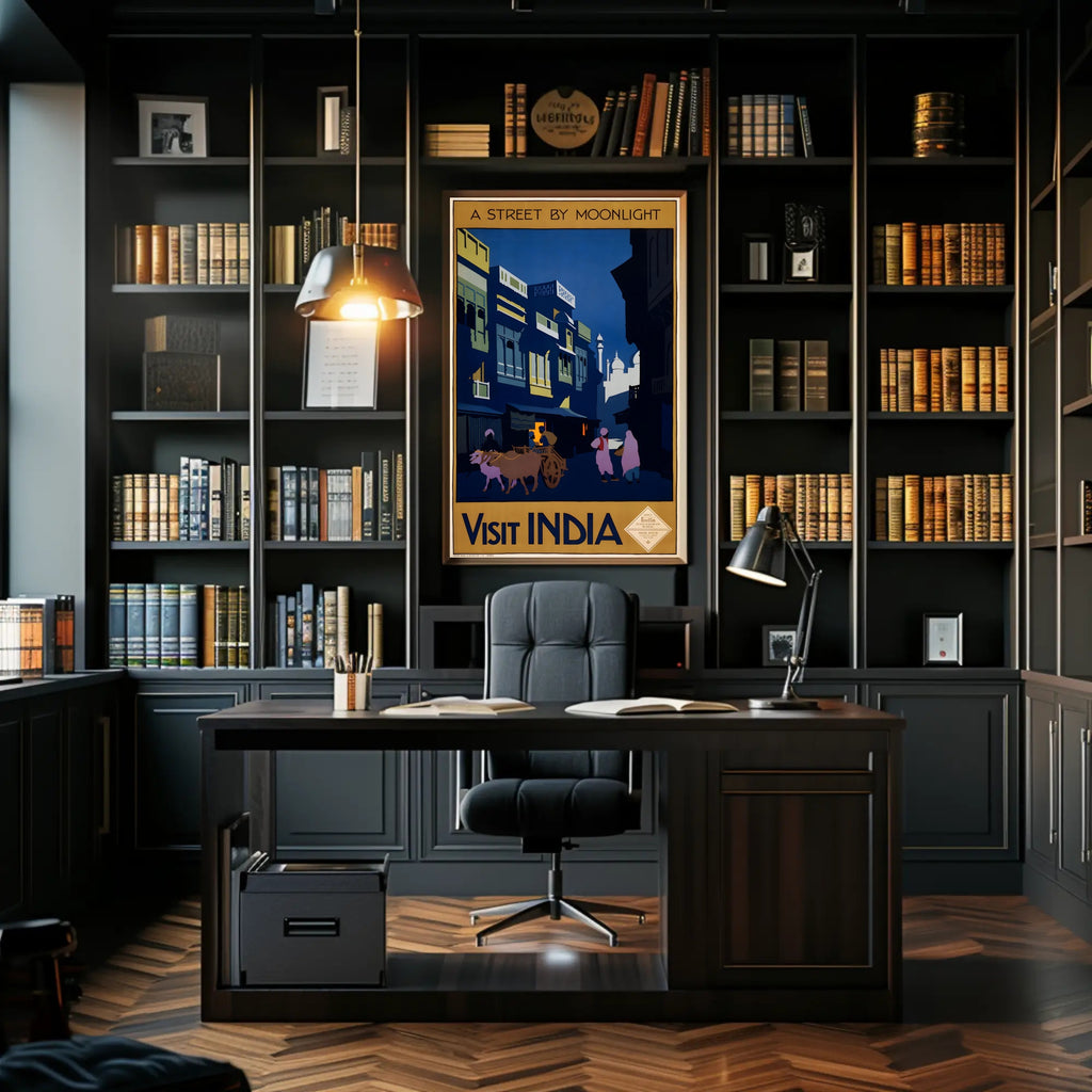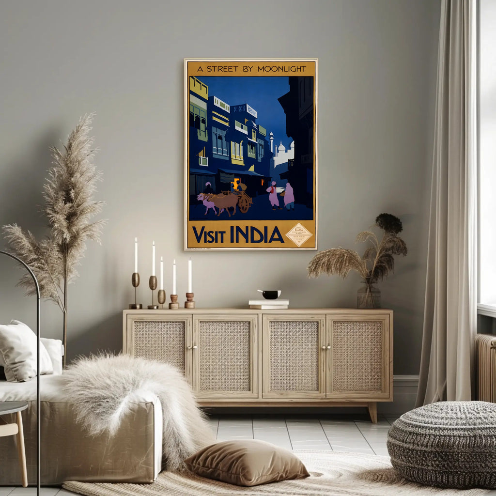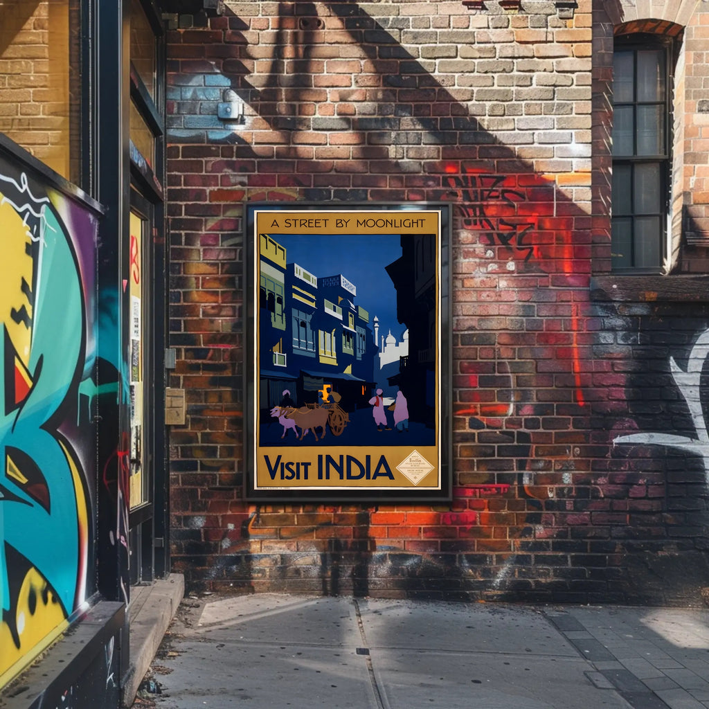 Transport yourself to the enchanting streets of India with this captivating vintage travel poster. Set under a mystical moonlit sky, the illustration invites viewers to explore a traditional Indian urban landscape, complete with iconic arched windows and charming minarets. The scene, alive with daily life, features people strolling and an oxen-drawn cart, embodying the spirit of exploration. With its bold blues and yellows, the poster evokes a serene yet adventurous mood, making it an ideal piece for any travel enthusiast or lover of cultural artistry to showcase on their wall.