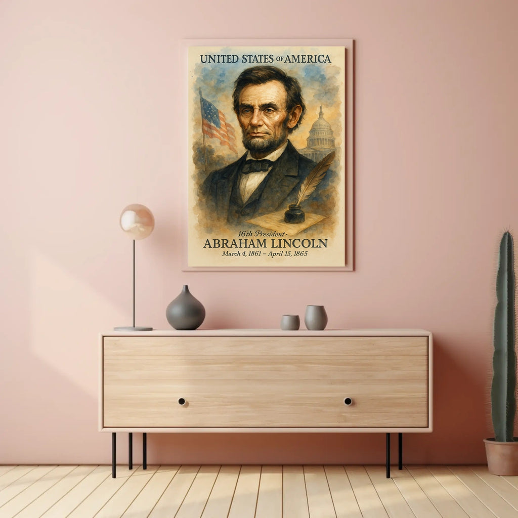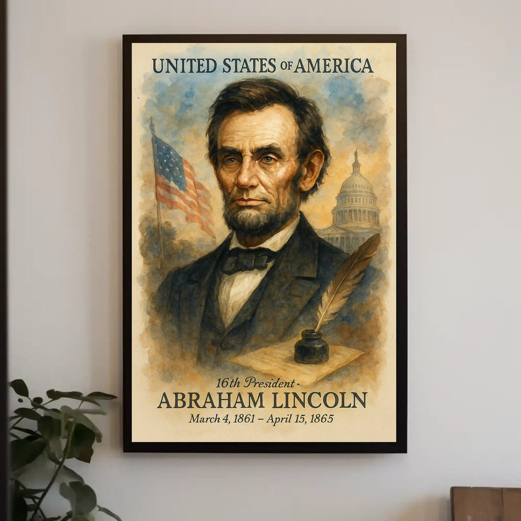 Abraham Lincoln vintage watercolor poster brings a bold, historic presence to your wall. This timeless portrait of the 16th President of the United States fuses classic portraiture with a soft watercolor glow, set against a vintage backdrop that nods to American history and the Capitol.