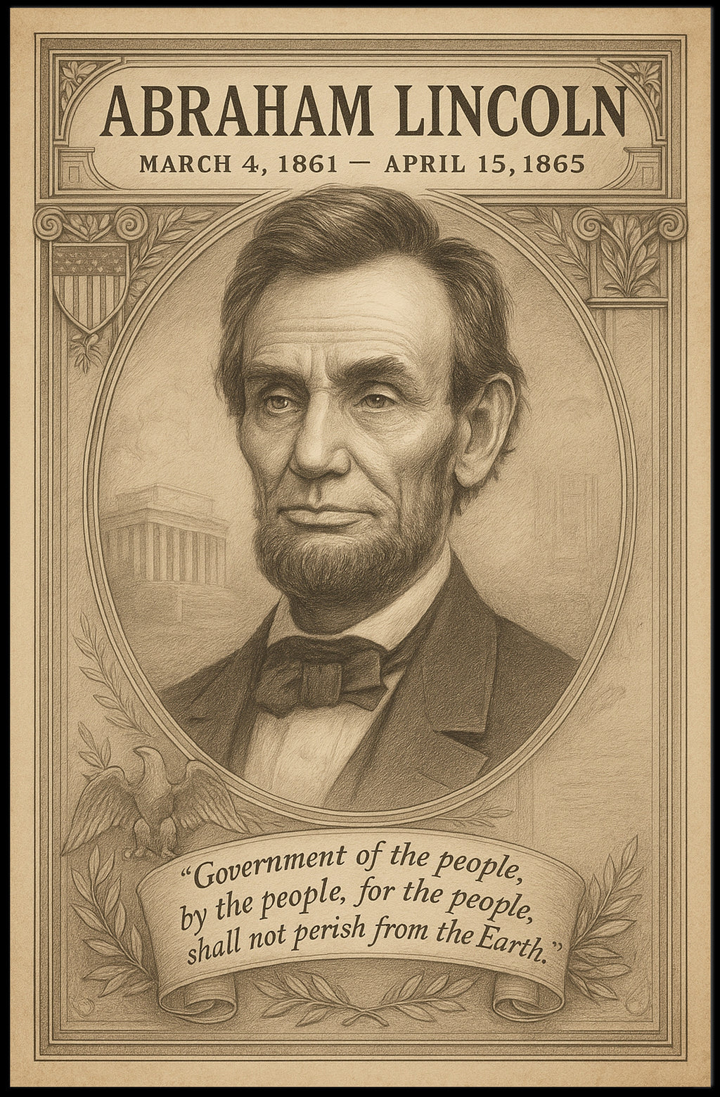 - Historic detail: Features Lincoln's presidential dates (March 4, 1861 — April 15, 1865), a subtle Lincoln Memorial motif in the background, an American eagle emblem, and the memorable Gettysburg Address line: “Government of the people, by the people, for the people…”.