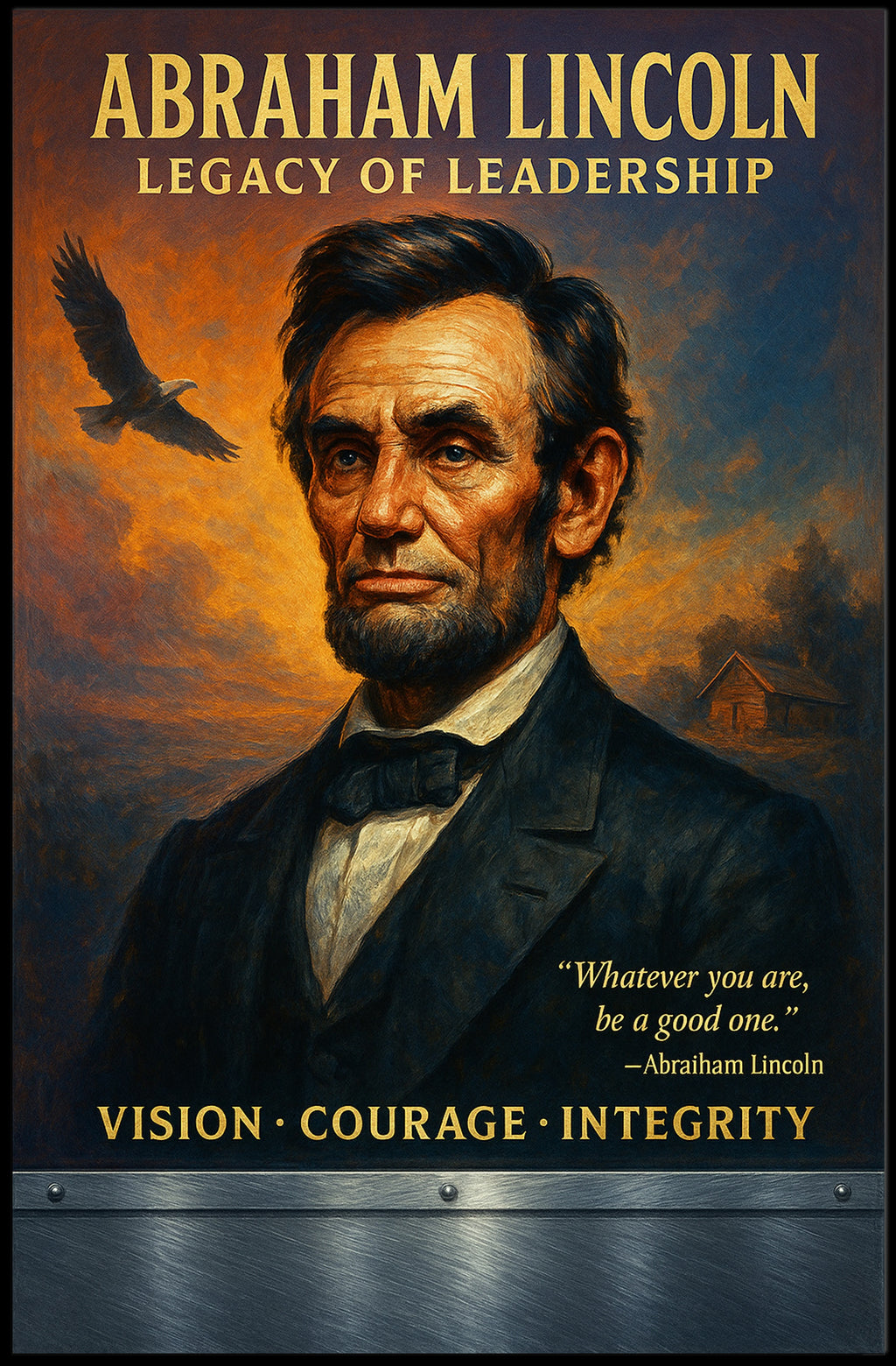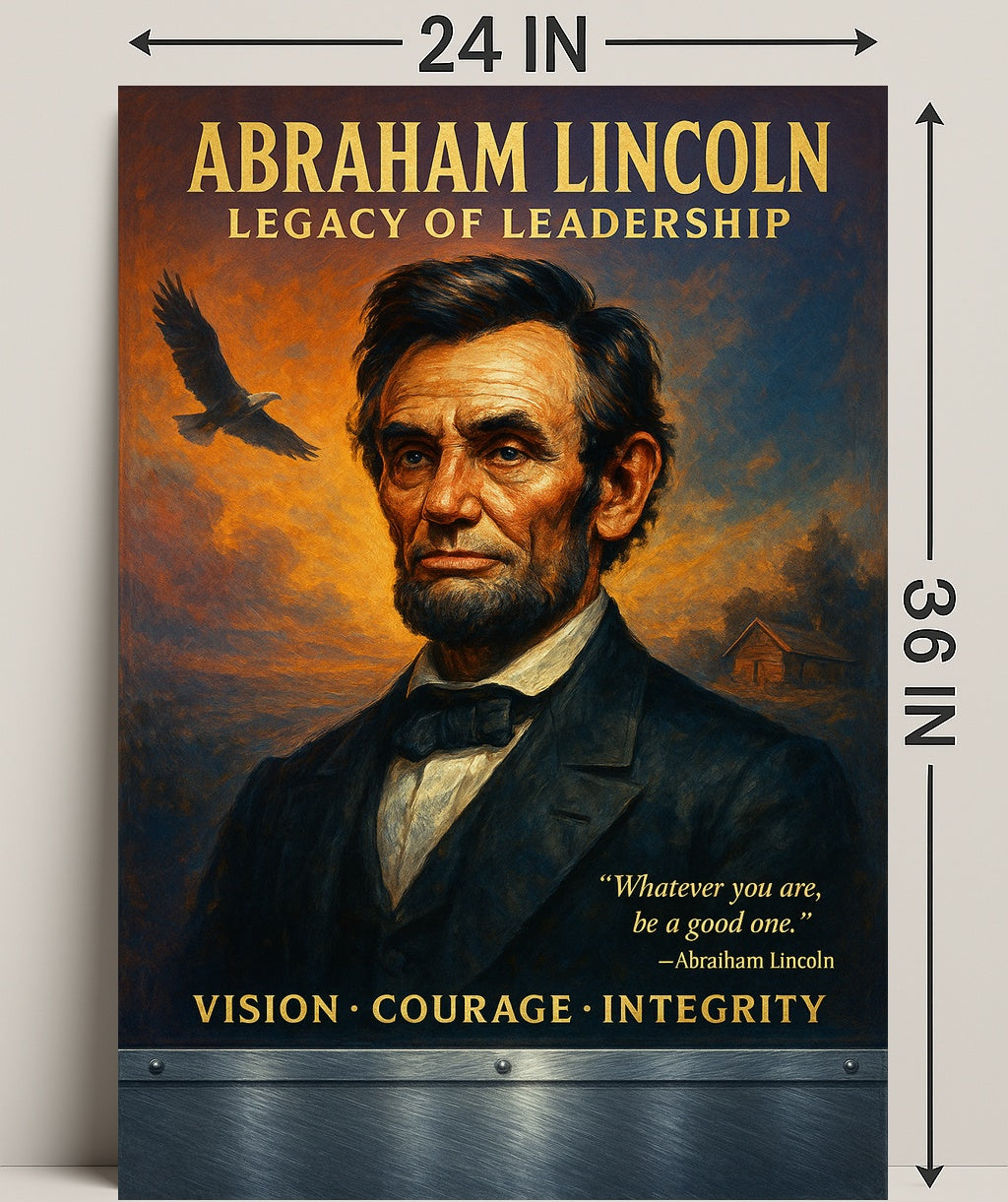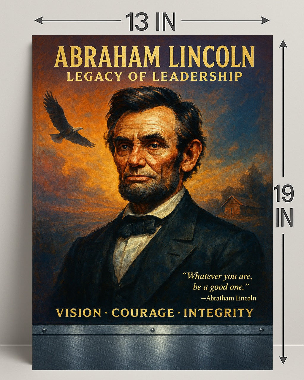 Celebrate American heritage with the Abraham Lincoln Leadership Portrait from PosterGoat — a striking historical poster that marries classic presidential portraiture with a moody, painterly aesthetic. This minimalist, artful print captures Lincoln's thoughtful expression against a warm, atmospheric sky, complete with a soaring bird and a distant log cabin that together evoke vision, courage, and integrity.