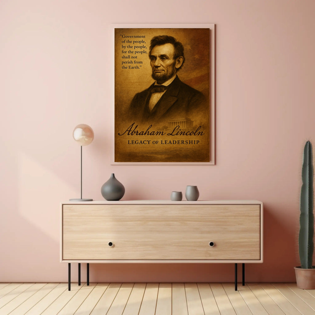 Bring a timeless symbol of leadership into your home with the Abraham Lincoln Legacy of Leadership Poster from PosterGoat. This sepia-toned art print captures a dignified portrait of Abraham Lincoln, overlaid with his enduring Gettysburg Address line, “Government of the people, by the people, for the people, shall not perish from the Earth.” The classical composition and warm, antique finish make it an ideal piece of historical decor and inspirational artwork for living rooms, offices, classrooms, or study spaces.