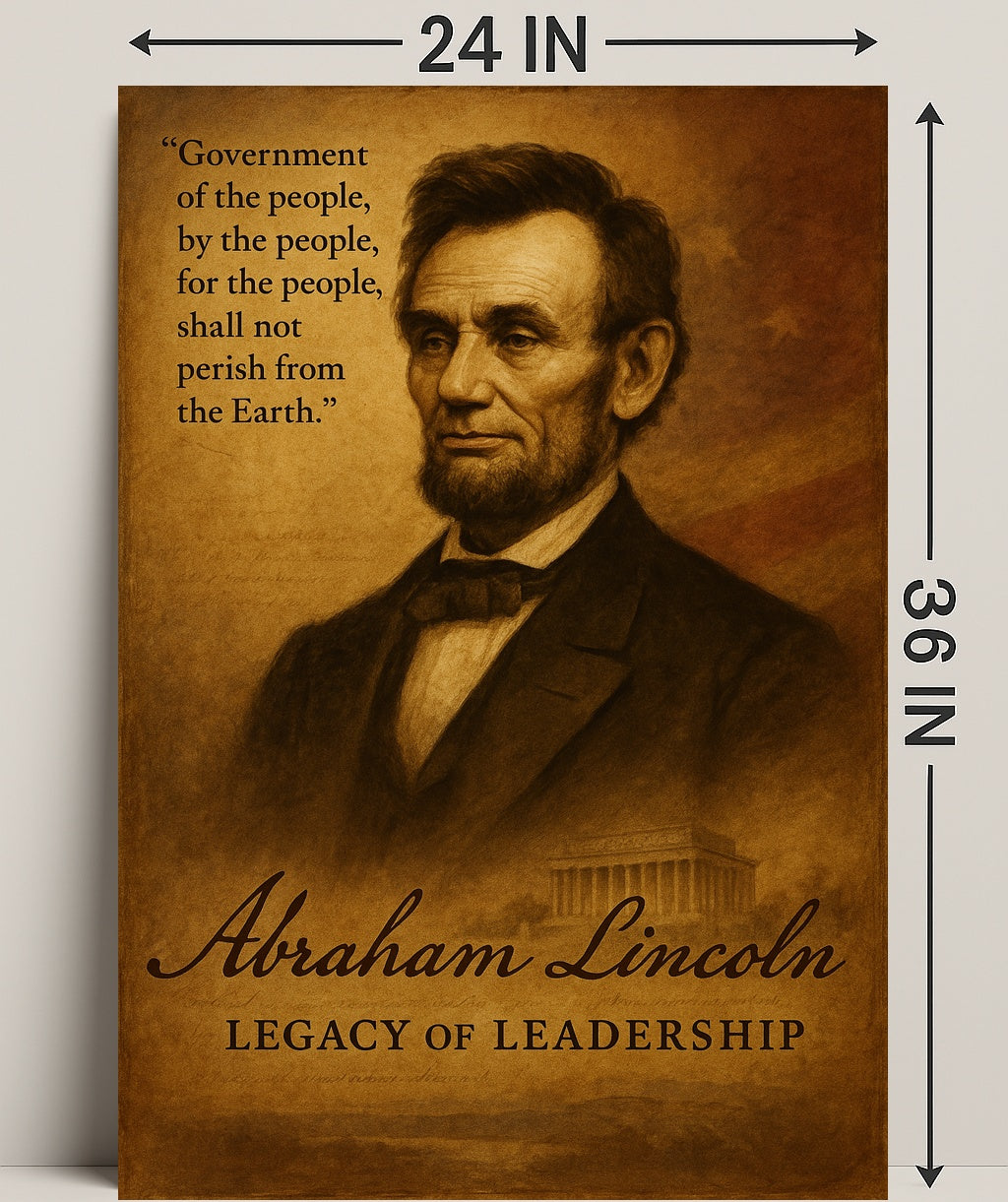 Bring a timeless symbol of leadership into your home with the Abraham Lincoln Legacy of Leadership Poster from PosterGoat. This sepia-toned art print captures a dignified portrait of Abraham Lincoln, overlaid with his enduring Gettysburg Address line, “Government of the people, by the people, for the people, shall not perish from the Earth.” The classical composition and warm, antique finish make it an ideal piece of historical decor and inspirational artwork for living rooms, offices, classrooms, or study spaces.