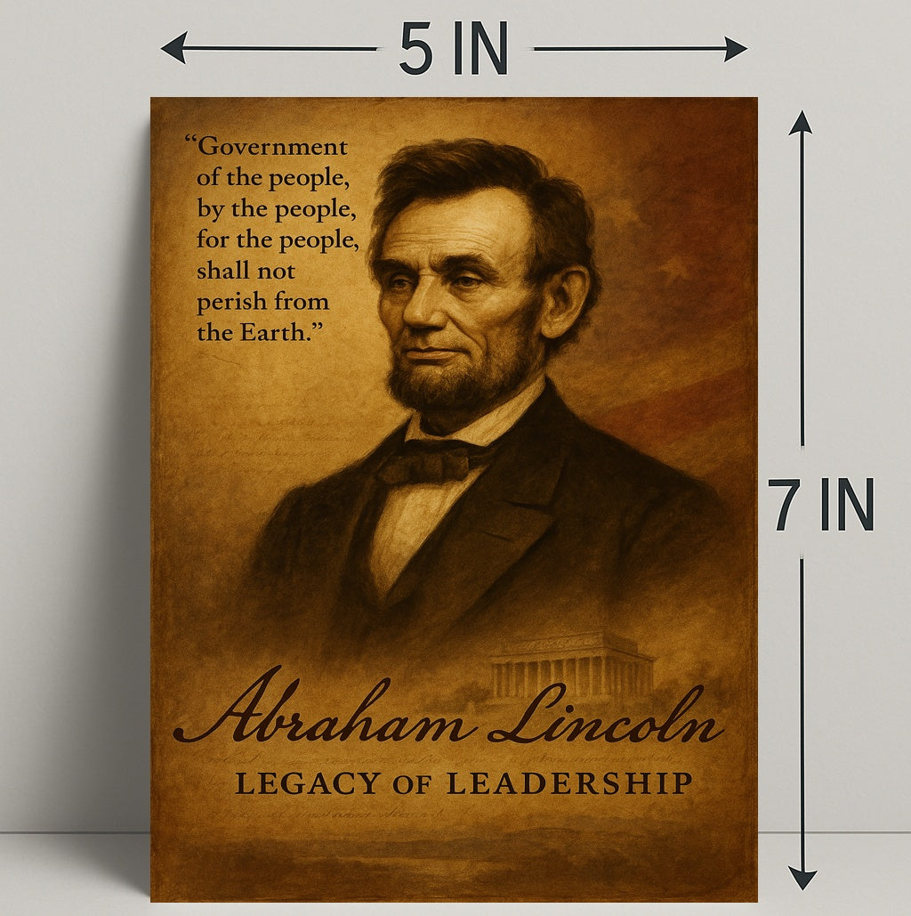Bring a timeless symbol of leadership into your home with the Abraham Lincoln Legacy of Leadership Poster from PosterGoat. This sepia-toned art print captures a dignified portrait of Abraham Lincoln, overlaid with his enduring Gettysburg Address line, “Government of the people, by the people, for the people, shall not perish from the Earth.” The classical composition and warm, antique finish make it an ideal piece of historical decor and inspirational artwork for living rooms, offices, classrooms, or study spaces.
