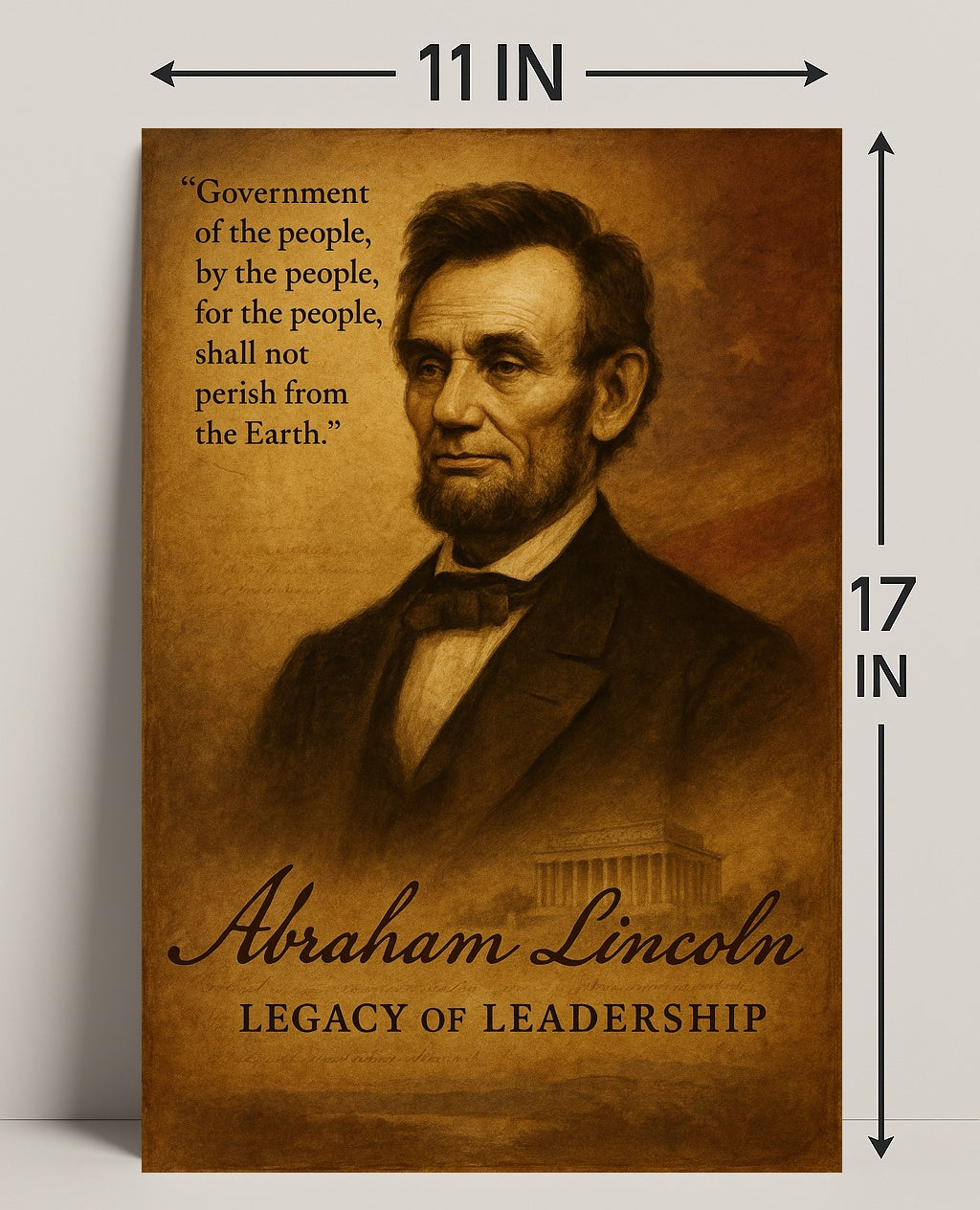 Bring a timeless symbol of leadership into your home with the Abraham Lincoln Legacy of Leadership Poster from PosterGoat. This sepia-toned art print captures a dignified portrait of Abraham Lincoln, overlaid with his enduring Gettysburg Address line, “Government of the people, by the people, for the people, shall not perish from the Earth.” The classical composition and warm, antique finish make it an ideal piece of historical decor and inspirational artwork for living rooms, offices, classrooms, or study spaces.