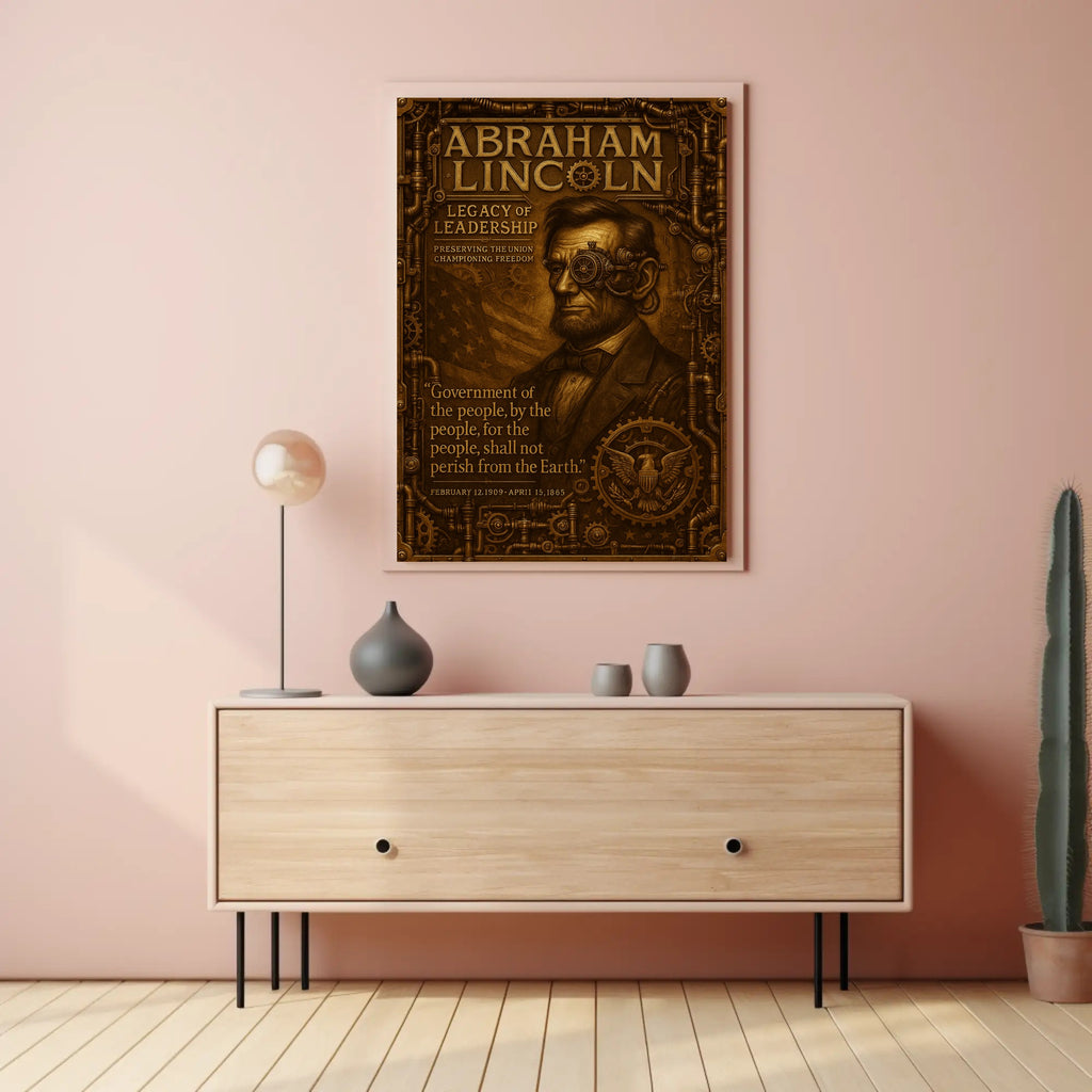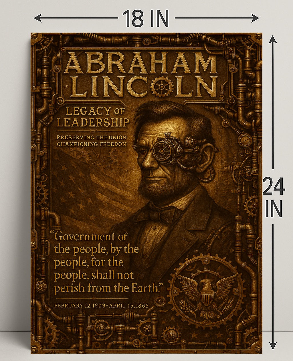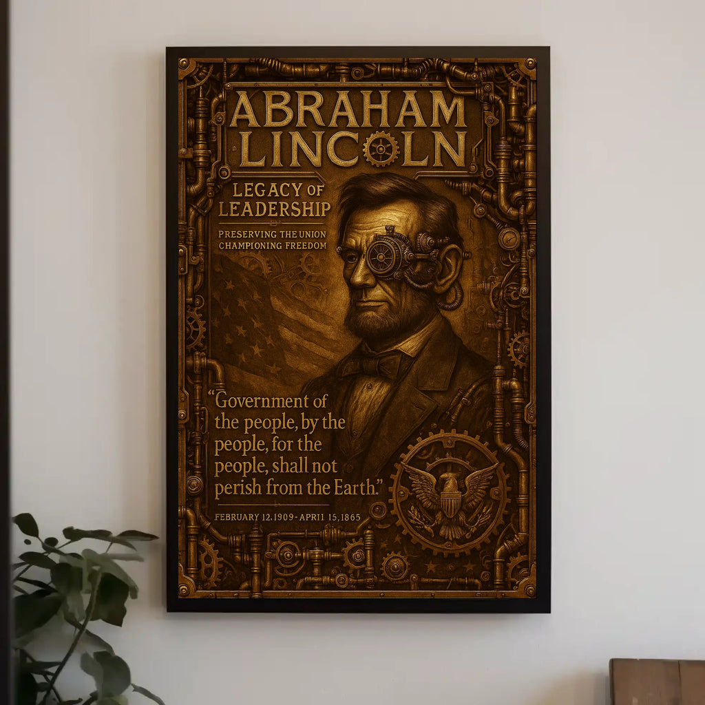 Honor one of America's most iconic leaders with the Abraham Lincoln Legacy Of Leadership Poster by PosterGoat — a striking art print that blends classical portraiture with intricate, steampunk-inspired detailing. Rendered in rich bronze tones, this poster presents Lincoln in embossed relief surrounded by gears, piping, and an ornate mechanical monocle that symbolizes innovation, resilience, and enduring leadership.