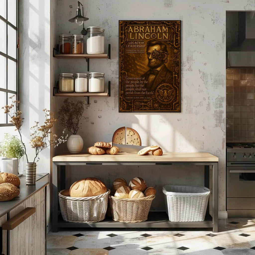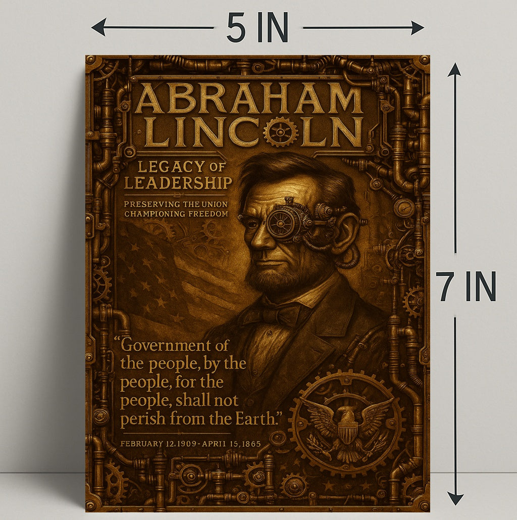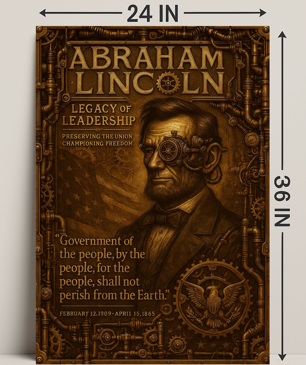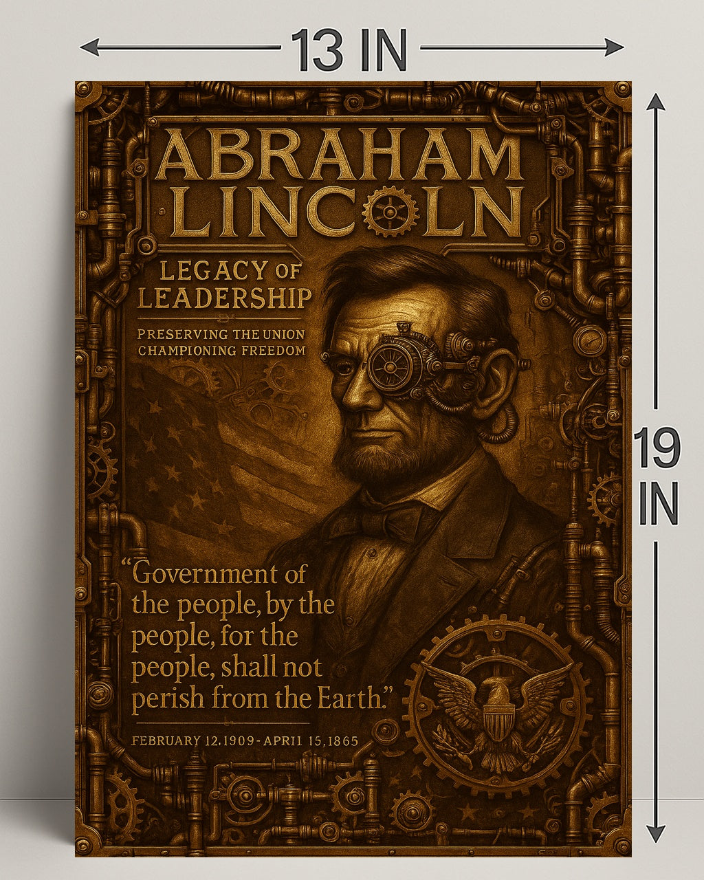 Honor one of America's most iconic leaders with the Abraham Lincoln Legacy Of Leadership Poster by PosterGoat — a striking art print that blends classical portraiture with intricate, steampunk-inspired detailing. Rendered in rich bronze tones, this poster presents Lincoln in embossed relief surrounded by gears, piping, and an ornate mechanical monocle that symbolizes innovation, resilience, and enduring leadership.