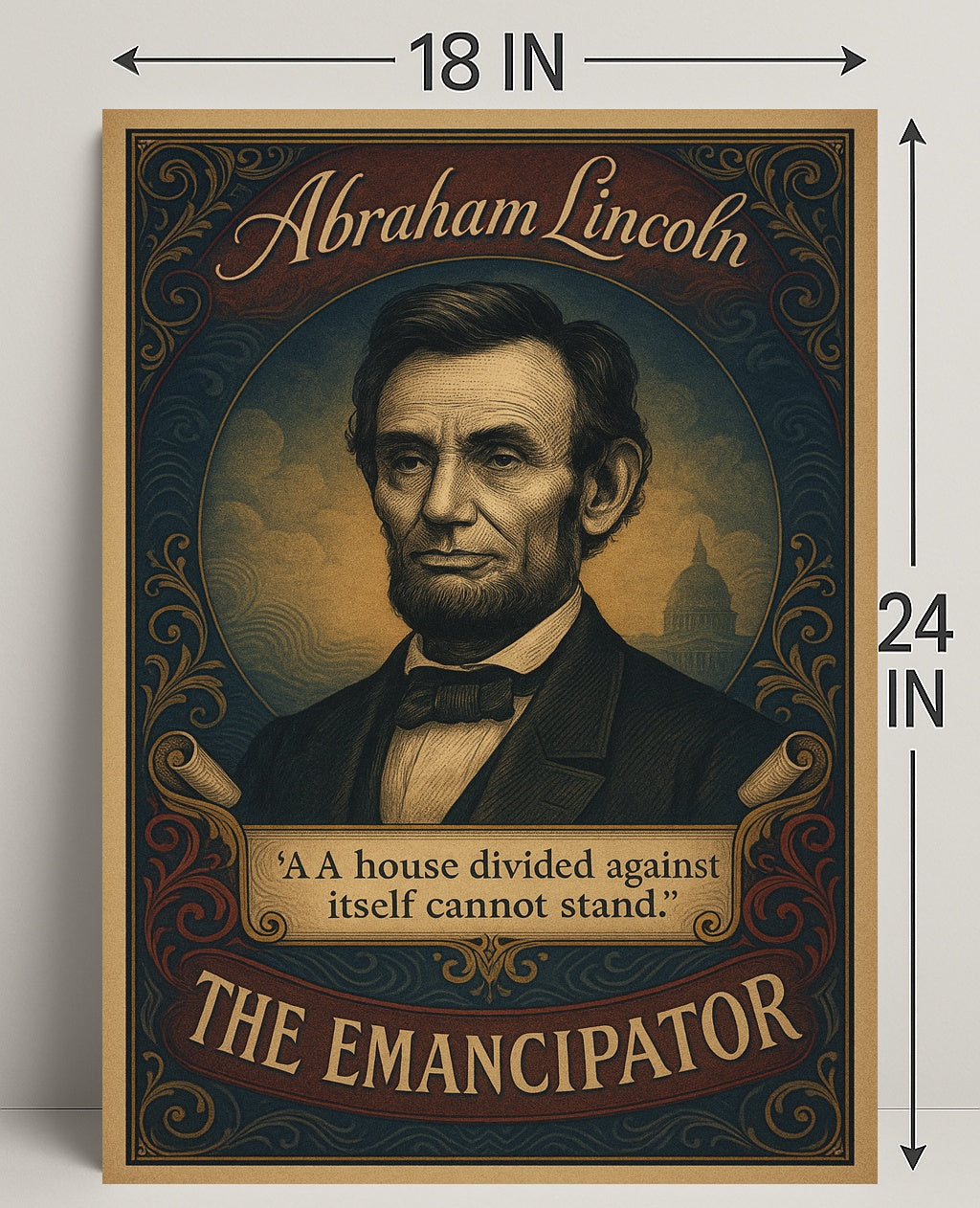 Celebrate American history with the Abraham Lincoln The Emancipator Poster from PosterGoat — a finely detailed art print that blends classical illustration with vintage poster design. The richly textured portrait of Lincoln, framed by ornate filigree and a subtle Capitol dome in the background, makes a striking focal point for living rooms, offices, classrooms, and gallery walls.
