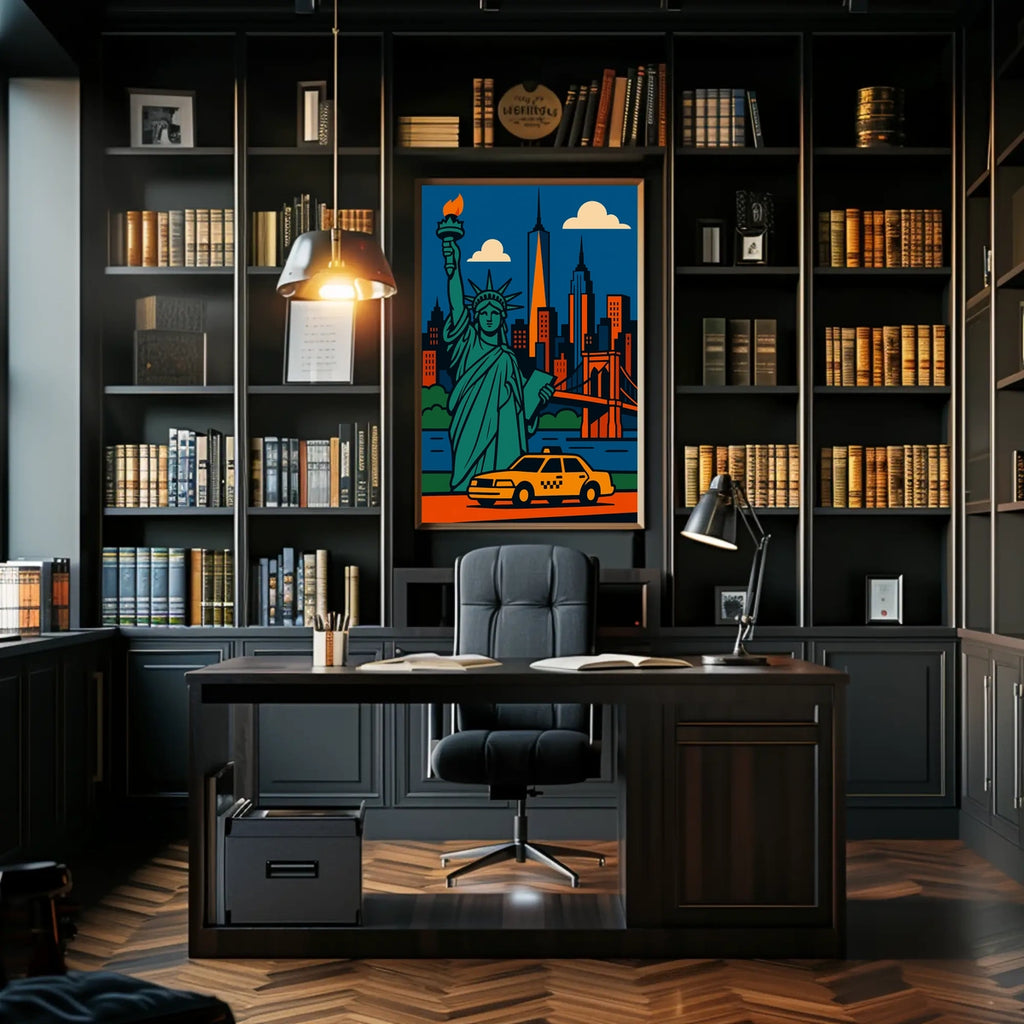 Contemporary poster aesthetic complements modern interiors, blending seamlessly with other art and decor for a cohesive, stylish look.
