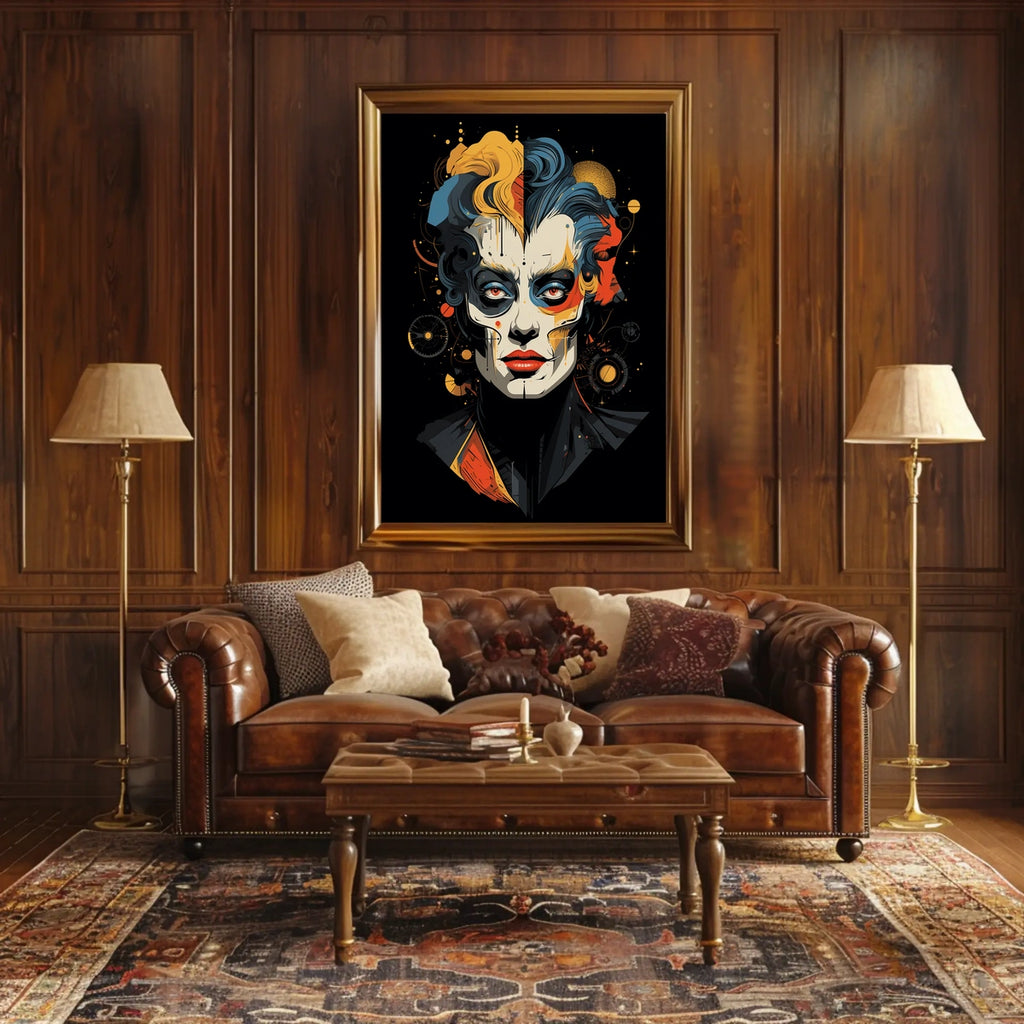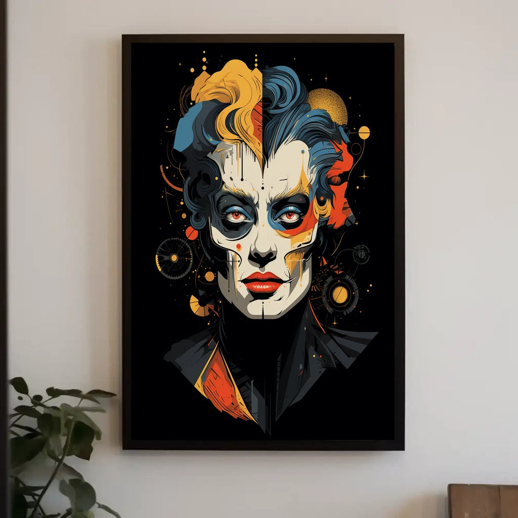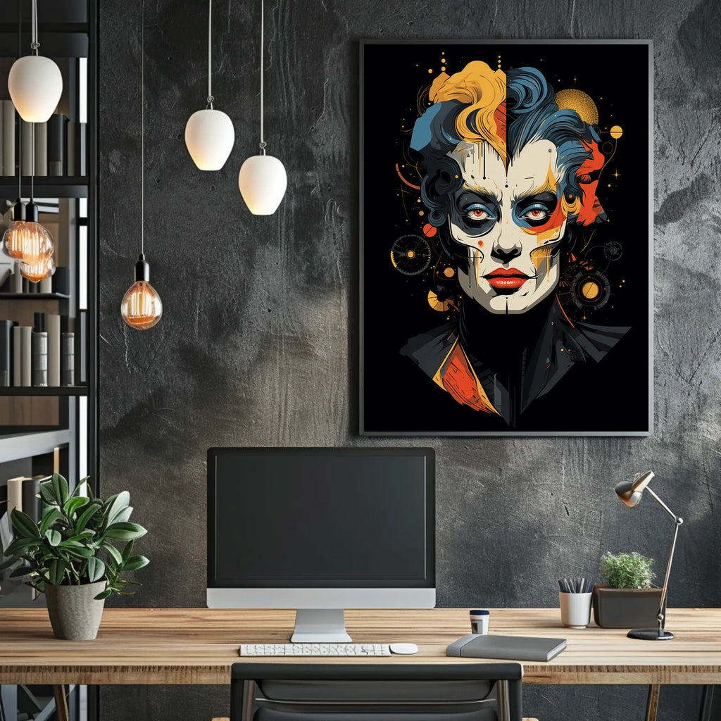 Abstract Artistic Poster with Geometric Shapes and Bold Colors — this abstract art poster blends classical portraiture with modern abstraction, creating a bold color decor that stands out. The artwork prominently showcases a split-face design, emphasized by geometric shapes in a spectrum of daring colors. This contemporary portrait art piece infuses any room with an avant-garde ambiance and invites interpretation, making it a standout addition to any modern abstract art print collection.