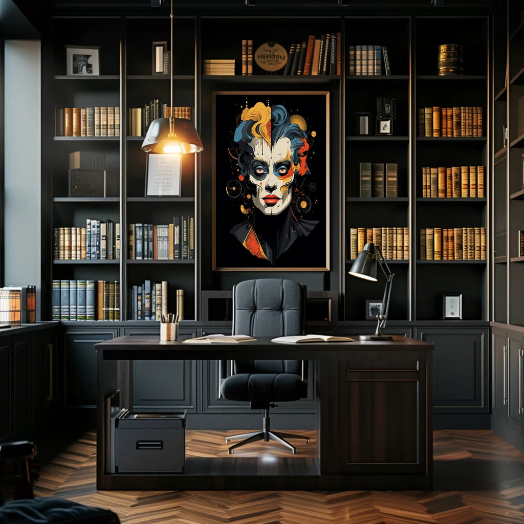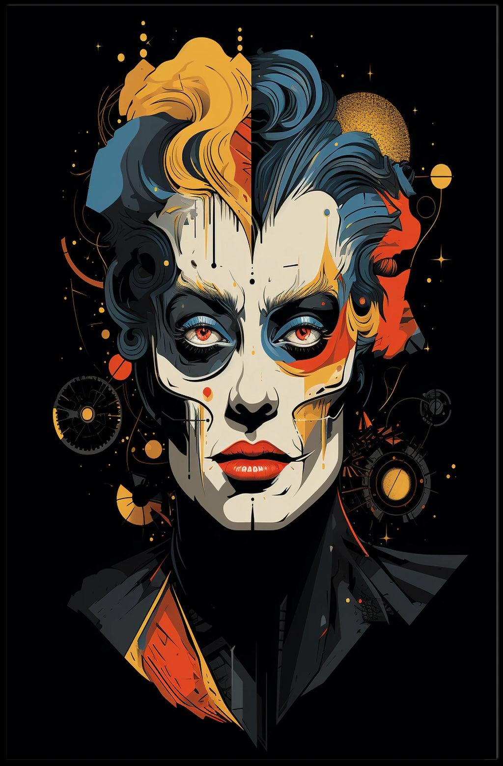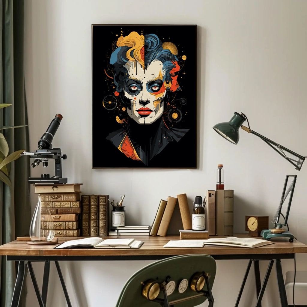Abstract Artistic Poster with Geometric Shapes and Bold Colors — this abstract art poster blends classical portraiture with modern abstraction, creating a bold color decor that stands out. The artwork prominently showcases a split-face design, emphasized by geometric shapes in a spectrum of daring colors. This contemporary portrait art piece infuses any room with an avant-garde ambiance and invites interpretation, making it a standout addition to any modern abstract art print collection.