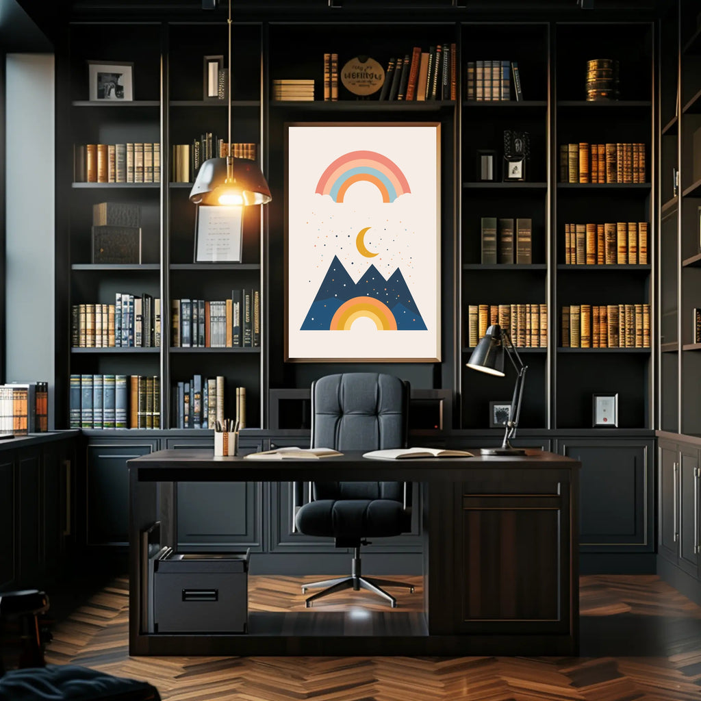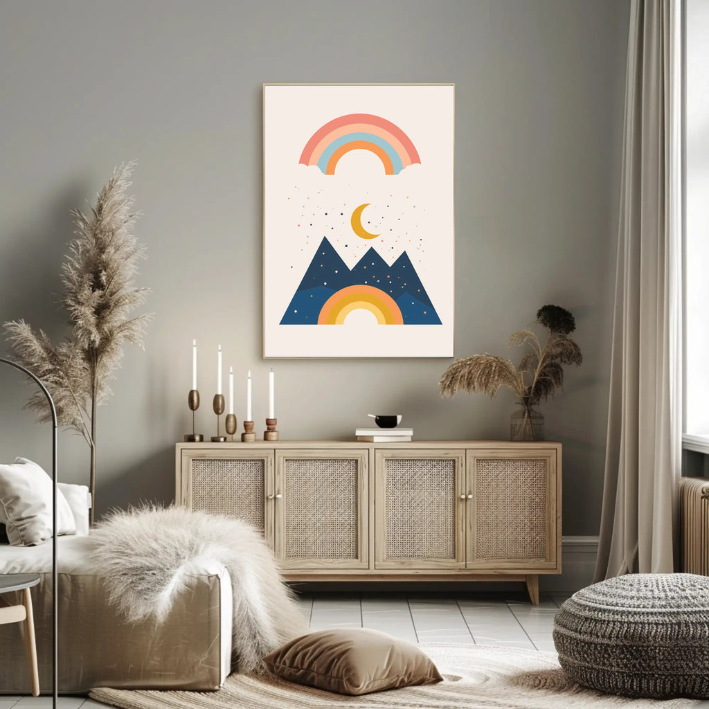 Whimsical Design: A vibrant rainbow and golden crescent moon float gracefully above stylized, geometric mountains, creating an eye-catching focal point.