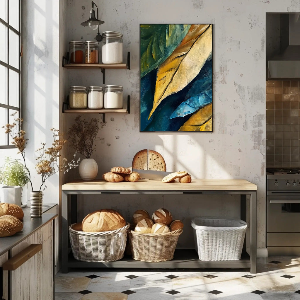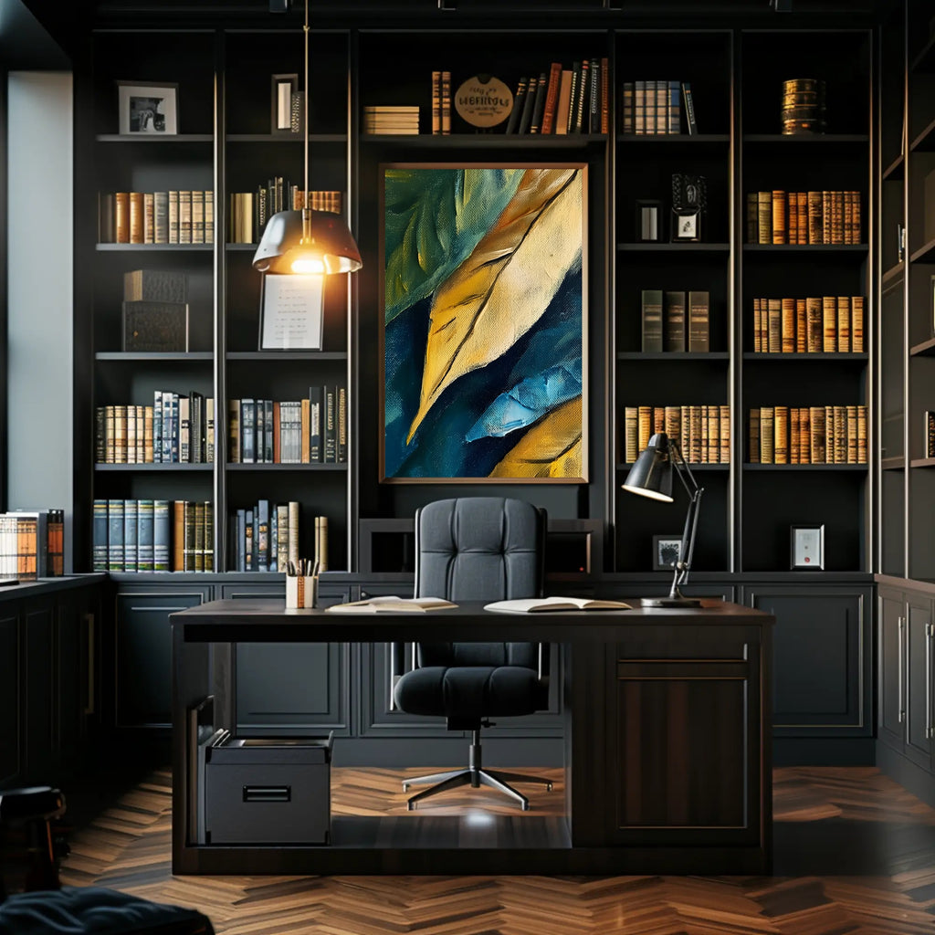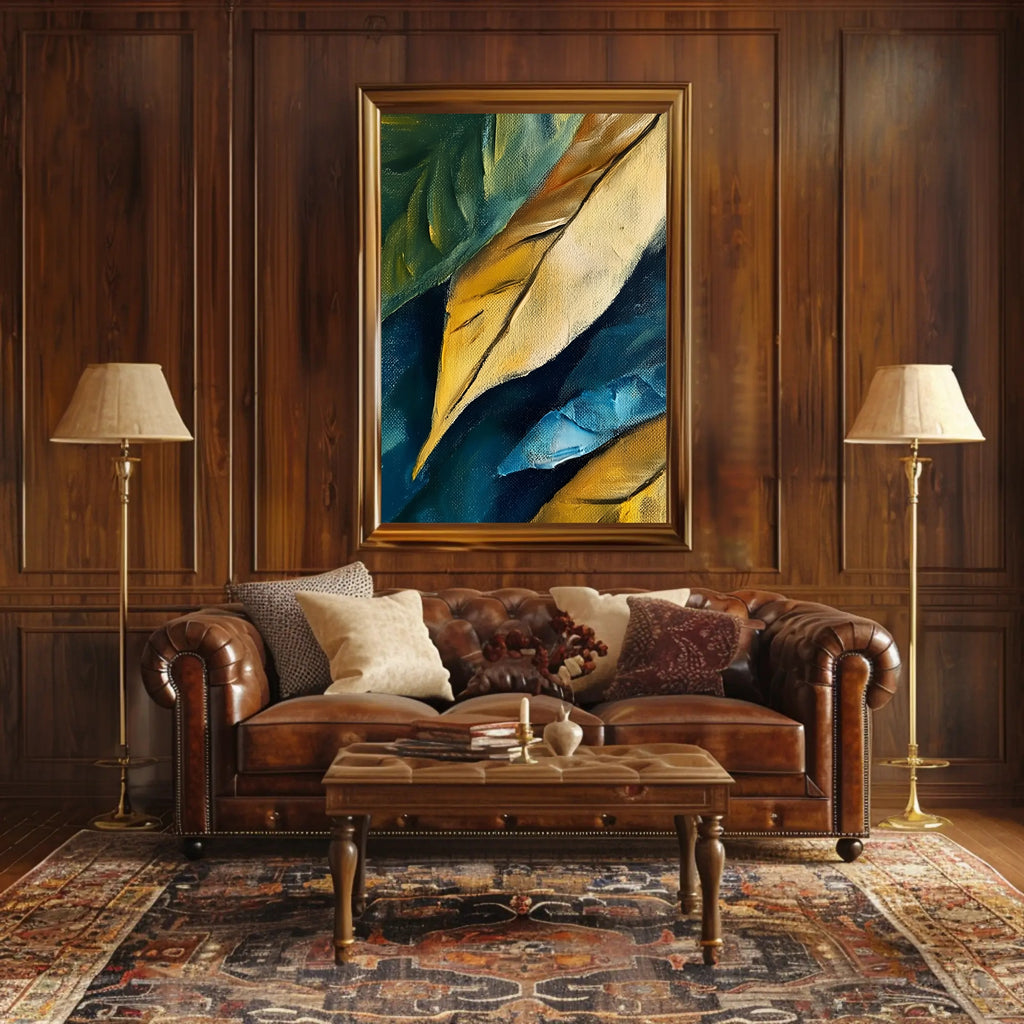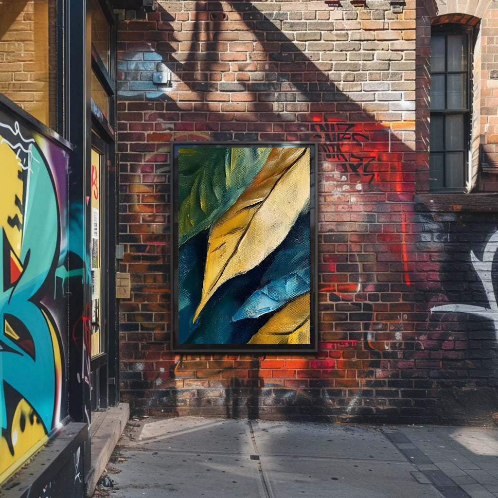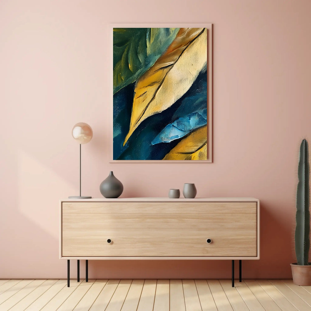 Abstract Colorful Canvas Poster by PosterGoat transforms any wall into a statement with rich, layered brushstrokes and vivid, gallery-quality color. This textured canvas print captures the tactile depth of original oil strokes—golden ochres, deep teals and vibrant blues—creating movement that reads beautifully from across the room.