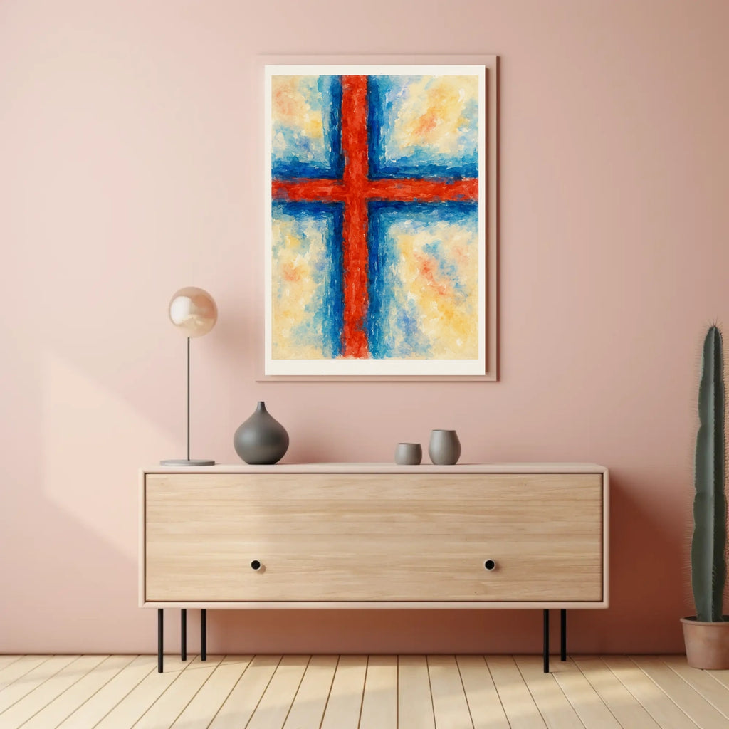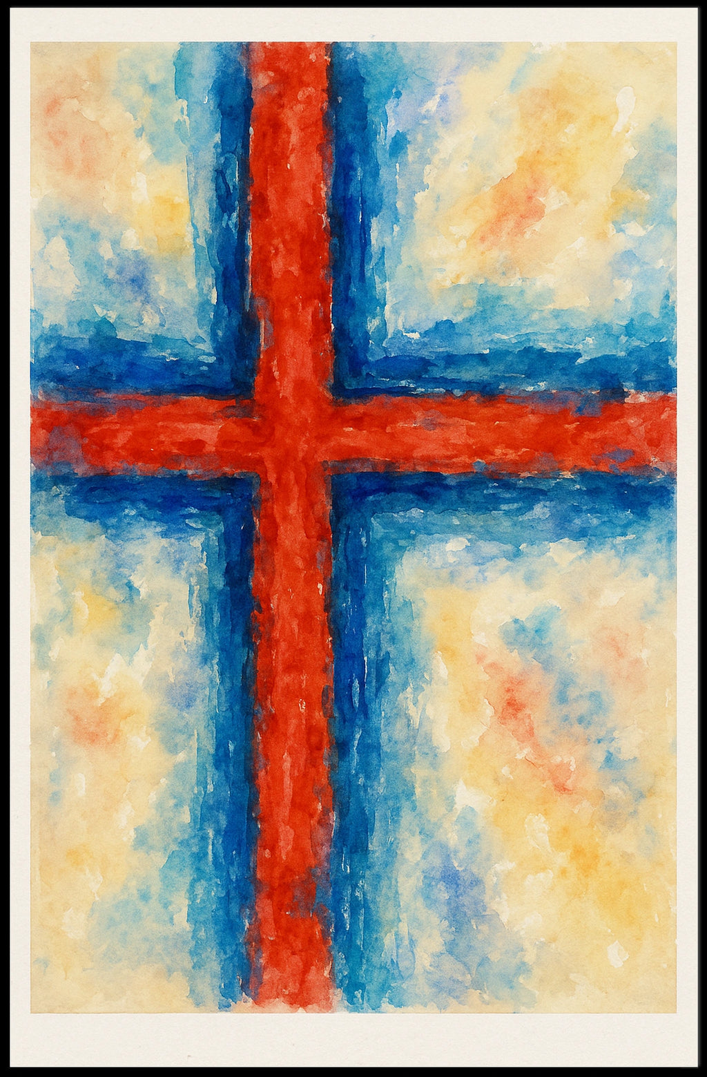 This abstract cross poster blends watercolor textures and modern composition to create a piece that feels both serene and bold.