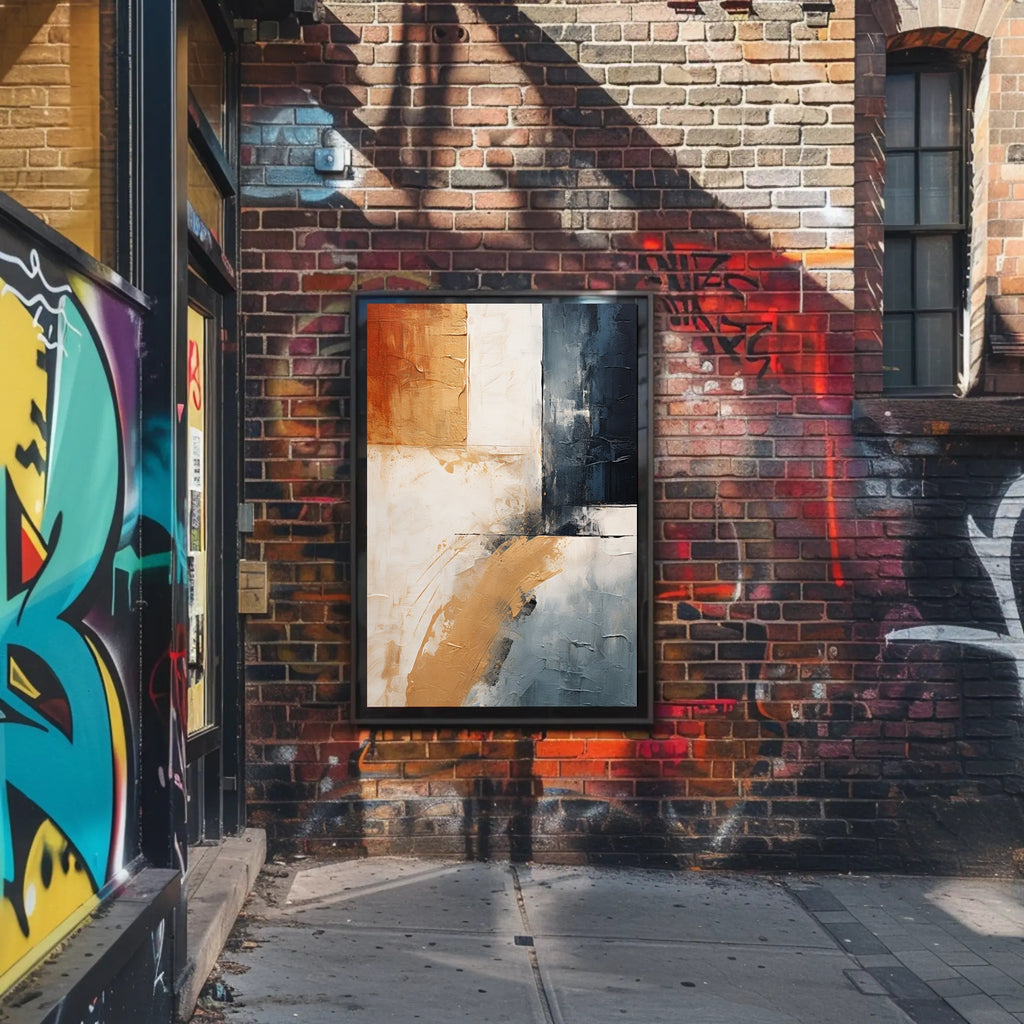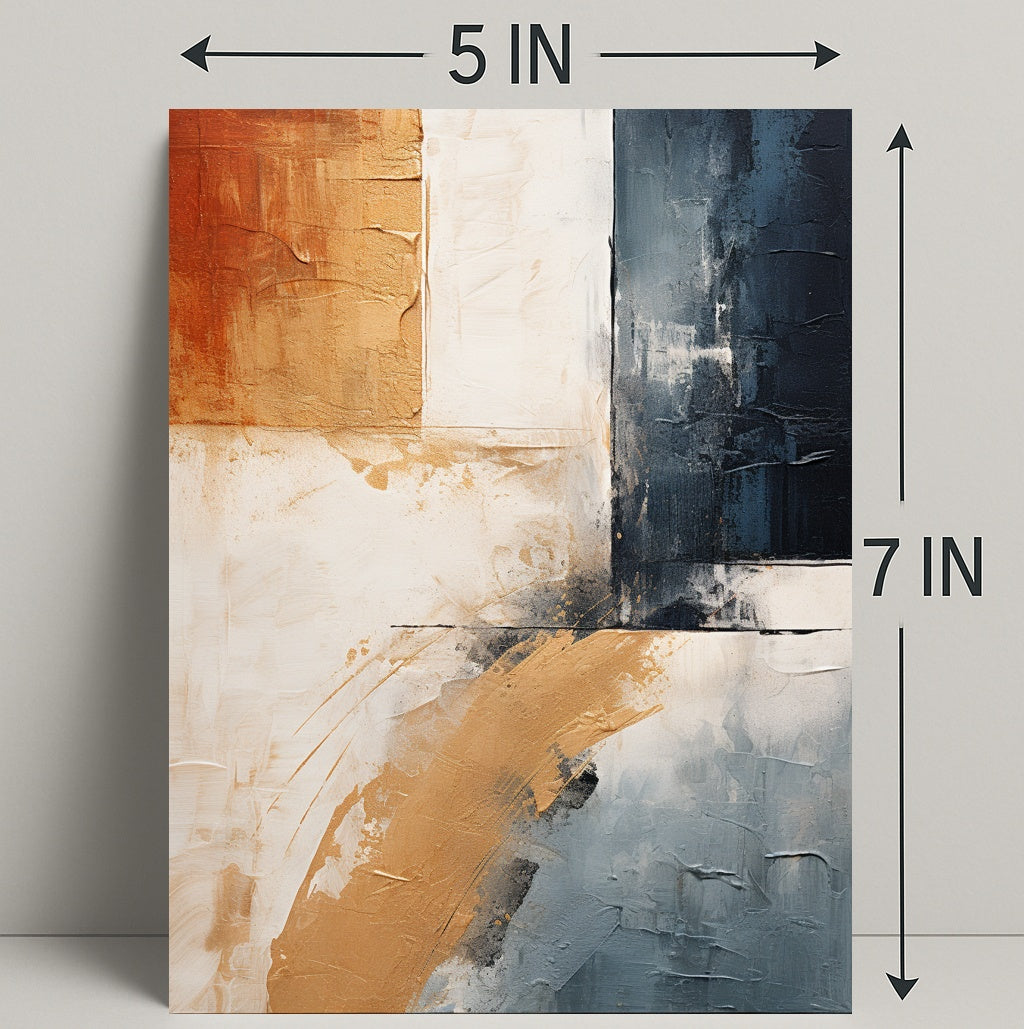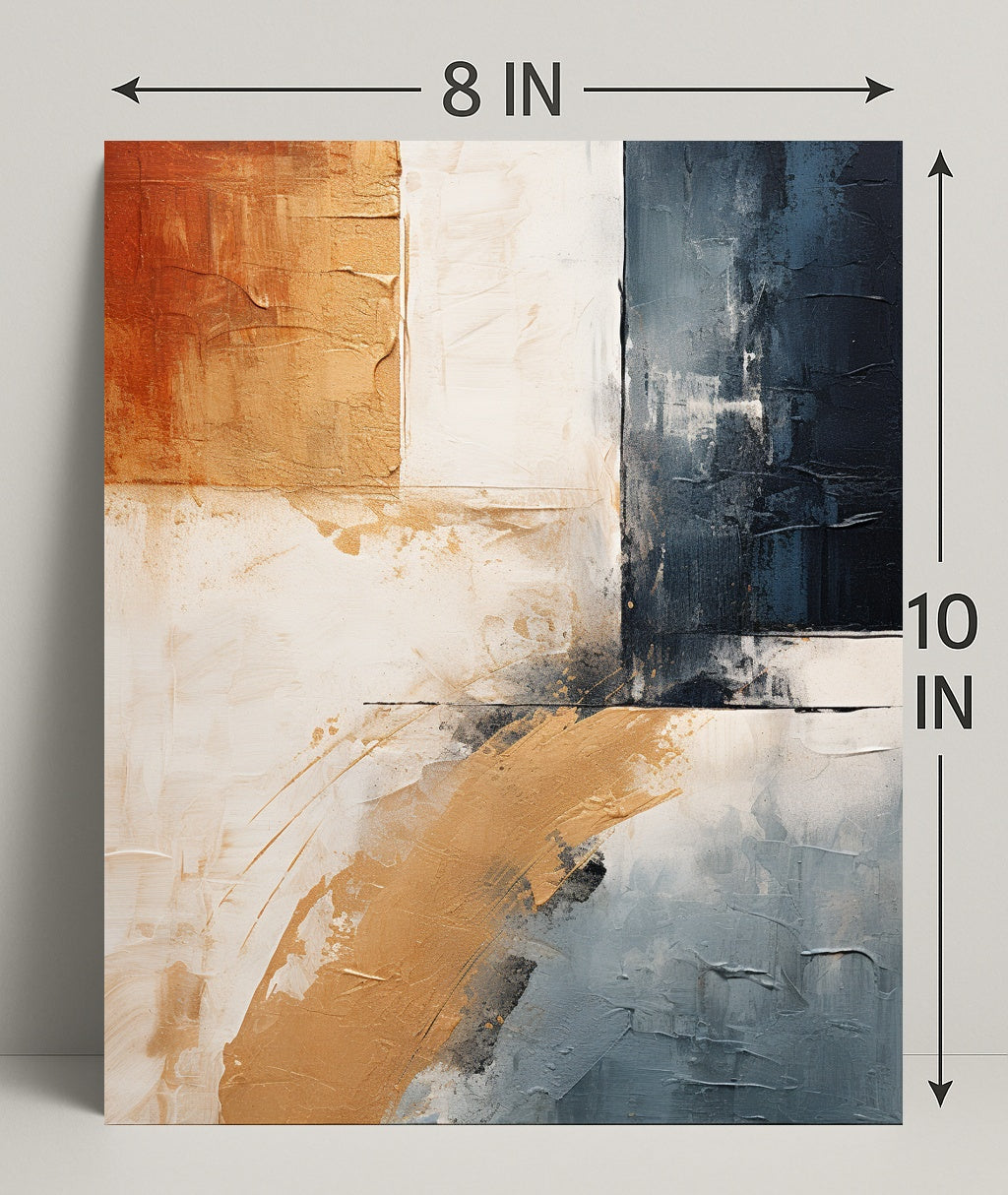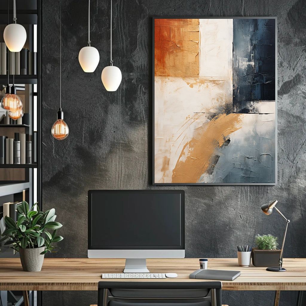 Abstract Expression Abstract Poster from PosterGoat transforms blank walls into a statement of contemporary art. This vertical poster features bold, textured brushstrokes in warm golds, deep navy and soft neutrals, creating an evocative composition that reads like a modern oil painting. The layered palette and visible impasto detail add depth and tactile interest—perfect for living rooms, offices, or gallery-style displays.