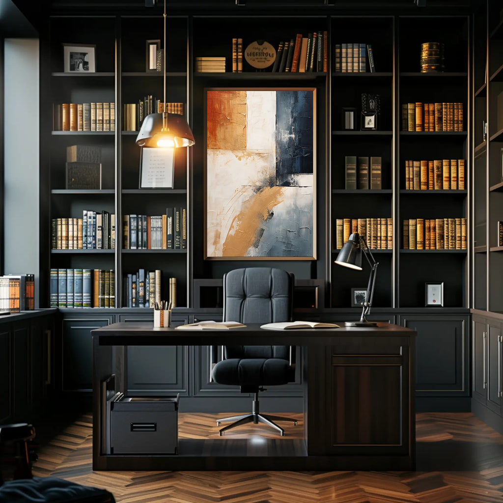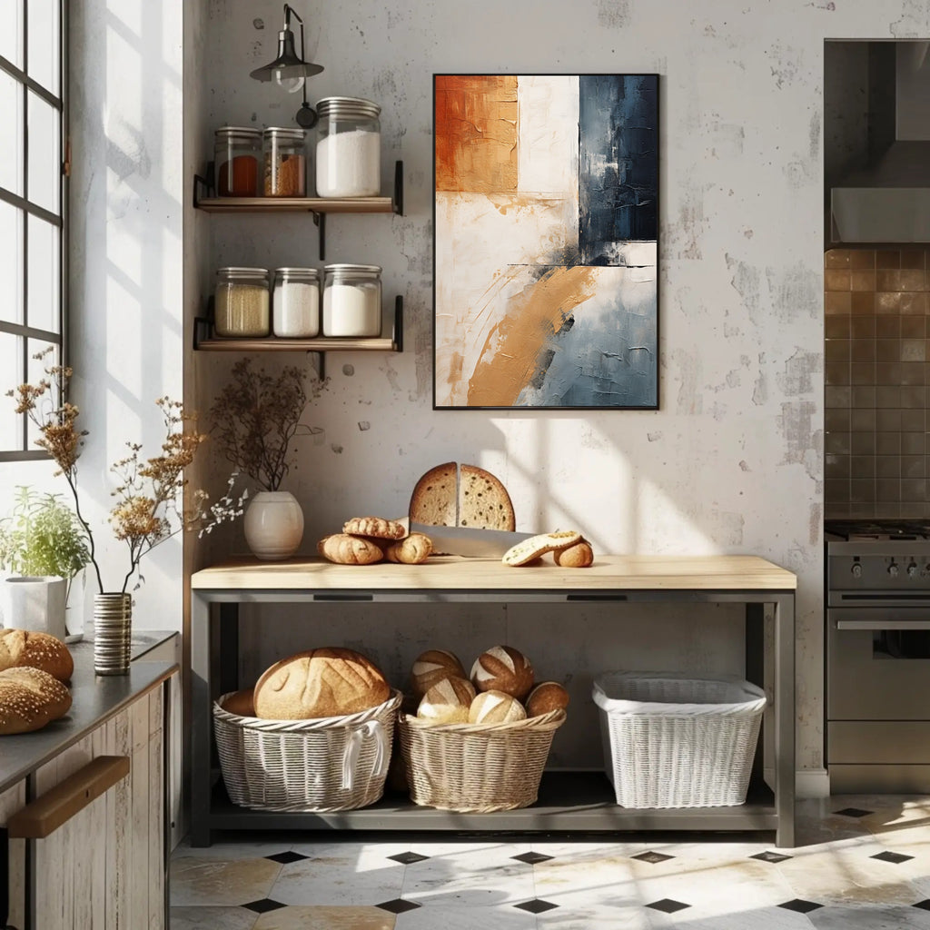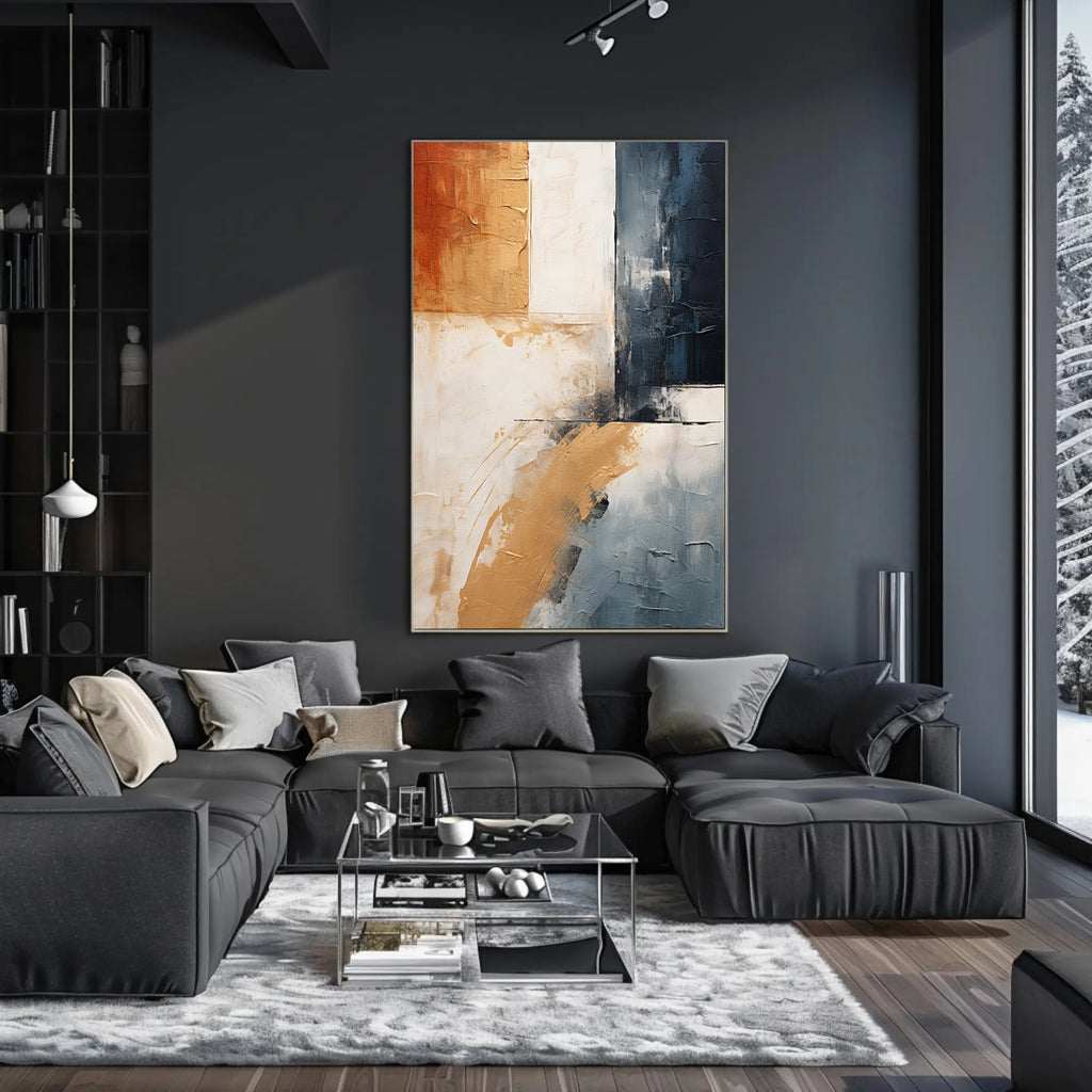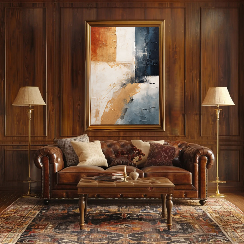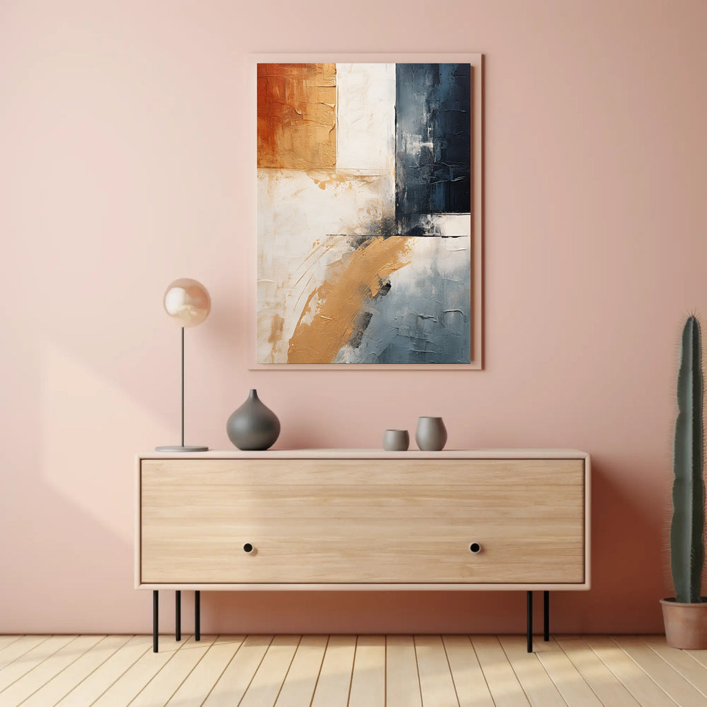 Abstract Expression Abstract Poster from PosterGoat transforms blank walls into a statement of contemporary art. This vertical poster features bold, textured brushstrokes in warm golds, deep navy and soft neutrals, creating an evocative composition that reads like a modern oil painting. The layered palette and visible impasto detail add depth and tactile interest—perfect for living rooms, offices, or gallery-style displays.