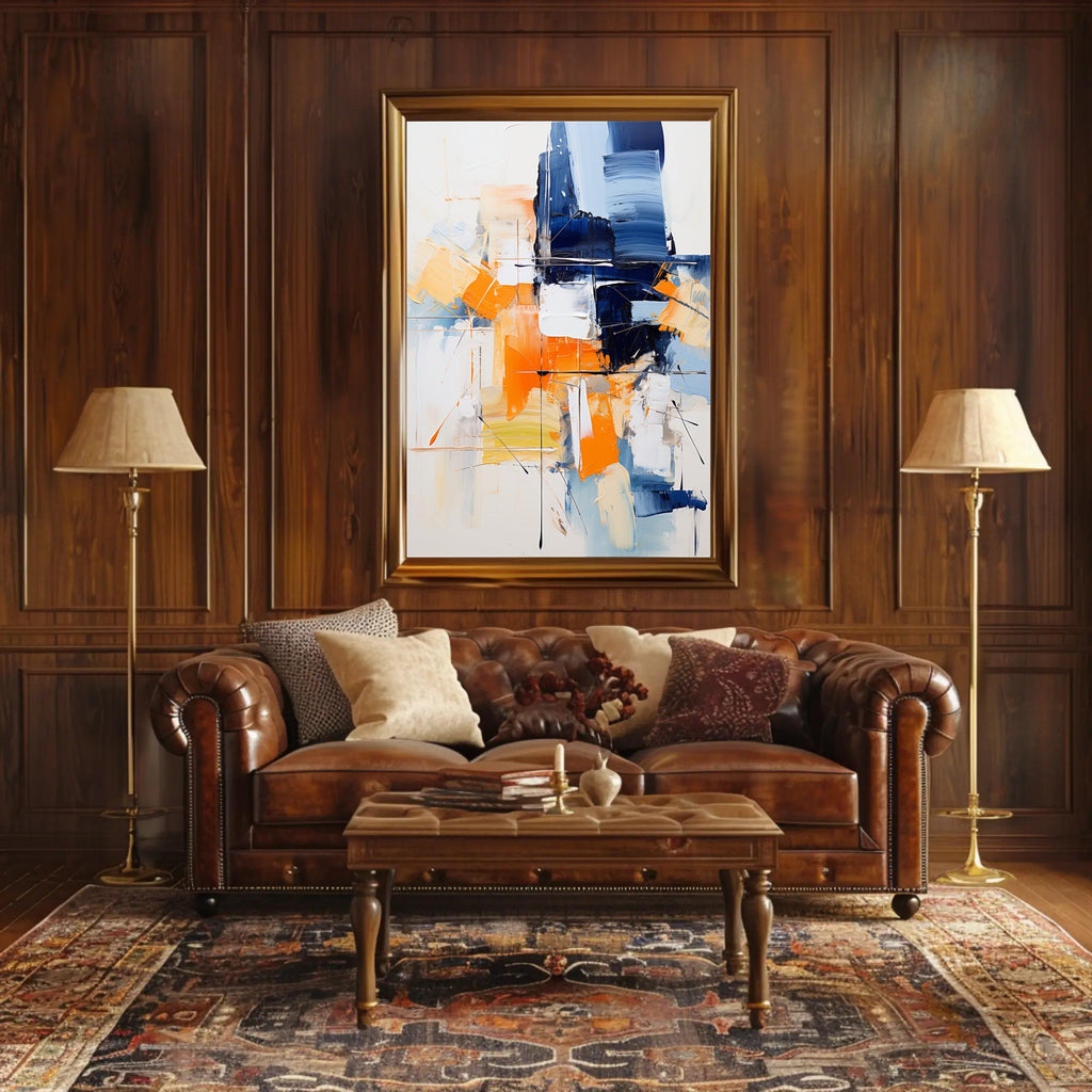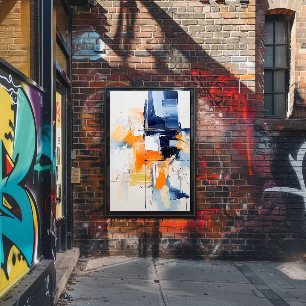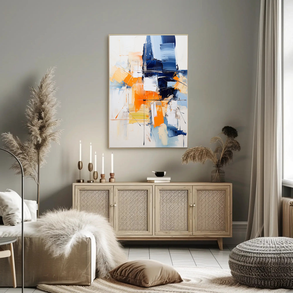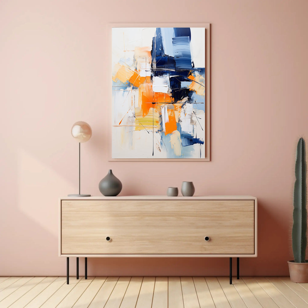 Bring energetic color and contemporary sophistication to your walls with the Abstract Expression Abstract Poster from PosterGoat. This abstract, expressionist print features bold navy and vibrant orange brushstrokes layered over soft neutrals, creating a striking focal point that complements modern living rooms, offices, or gallery-style interiors.