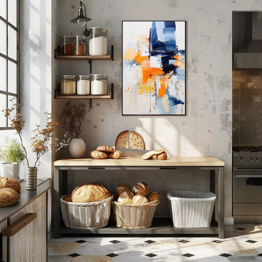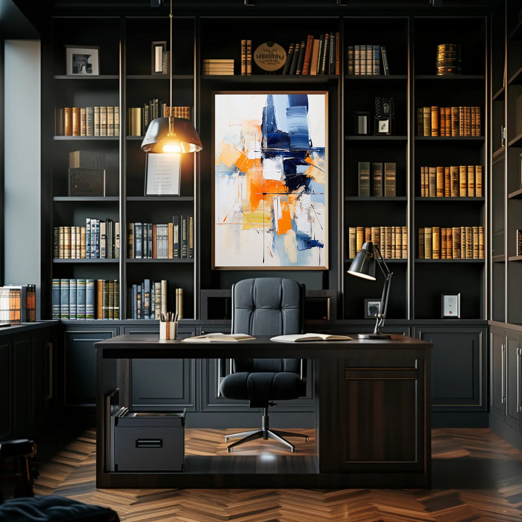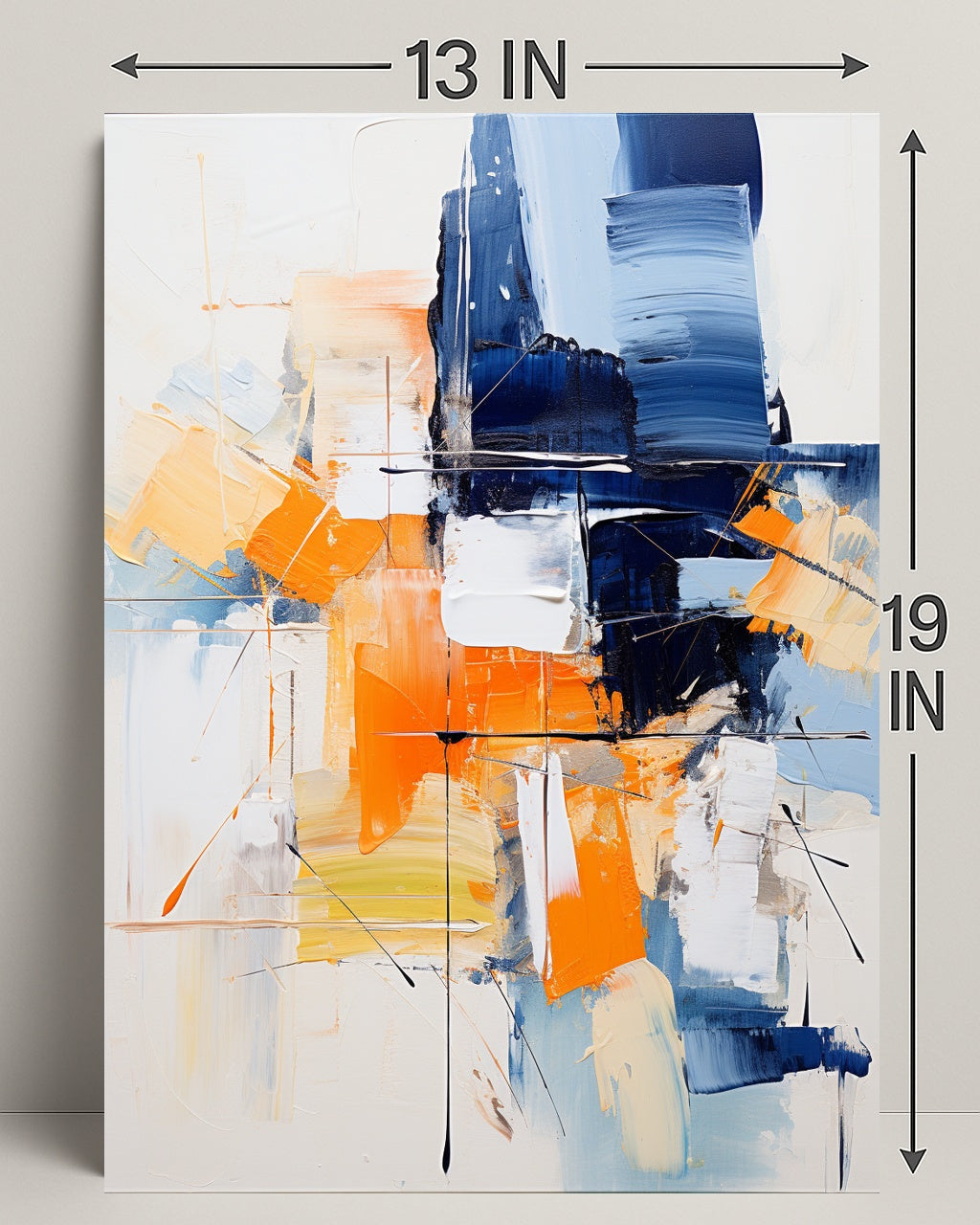 Bring energetic color and contemporary sophistication to your walls with the Abstract Expression Abstract Poster from PosterGoat. This abstract, expressionist print features bold navy and vibrant orange brushstrokes layered over soft neutrals, creating a striking focal point that complements modern living rooms, offices, or gallery-style interiors.