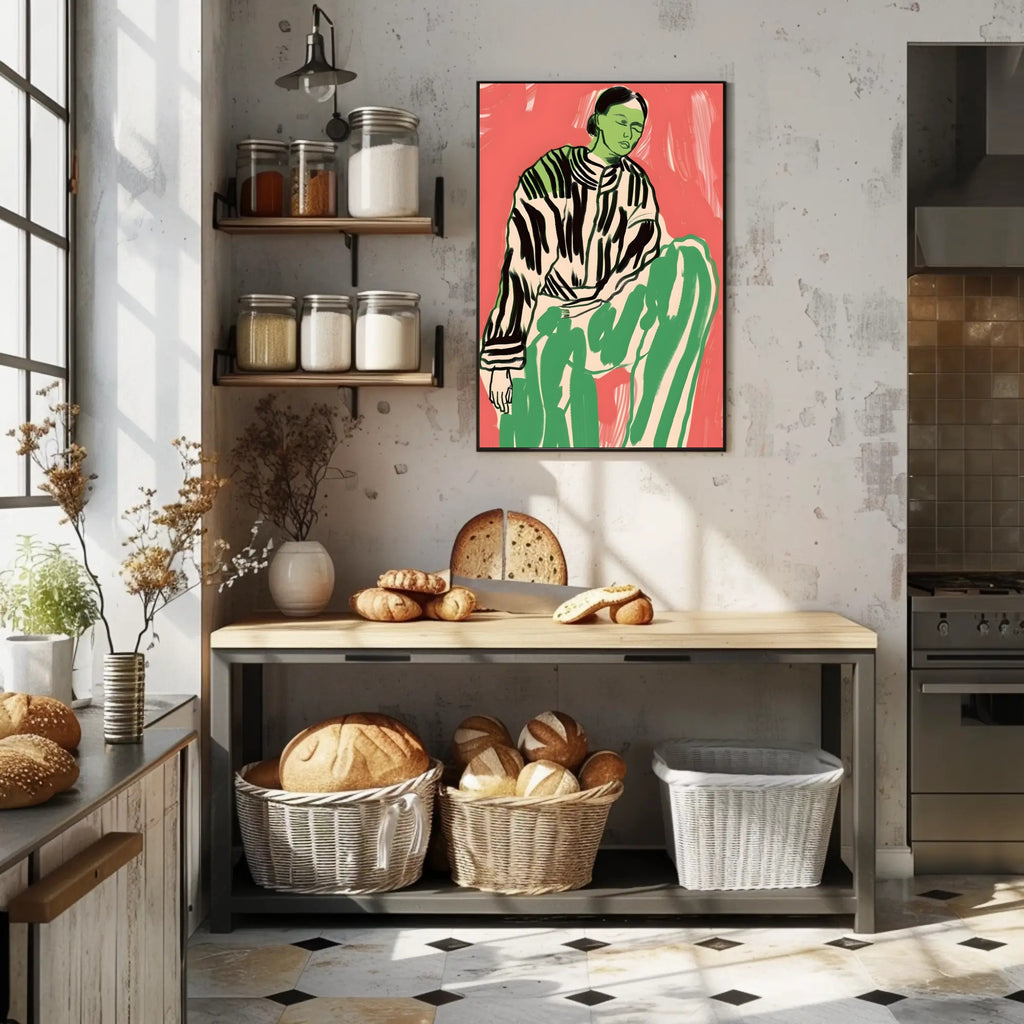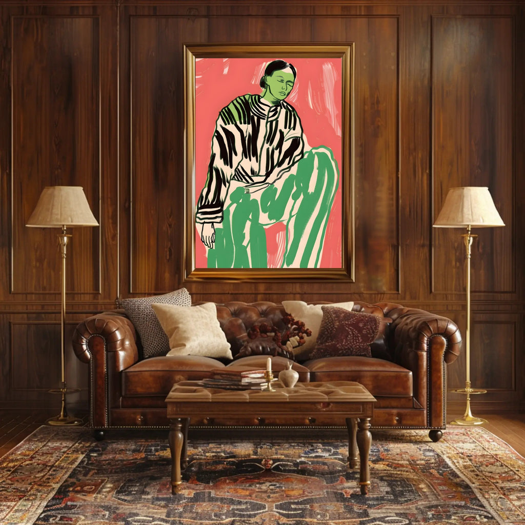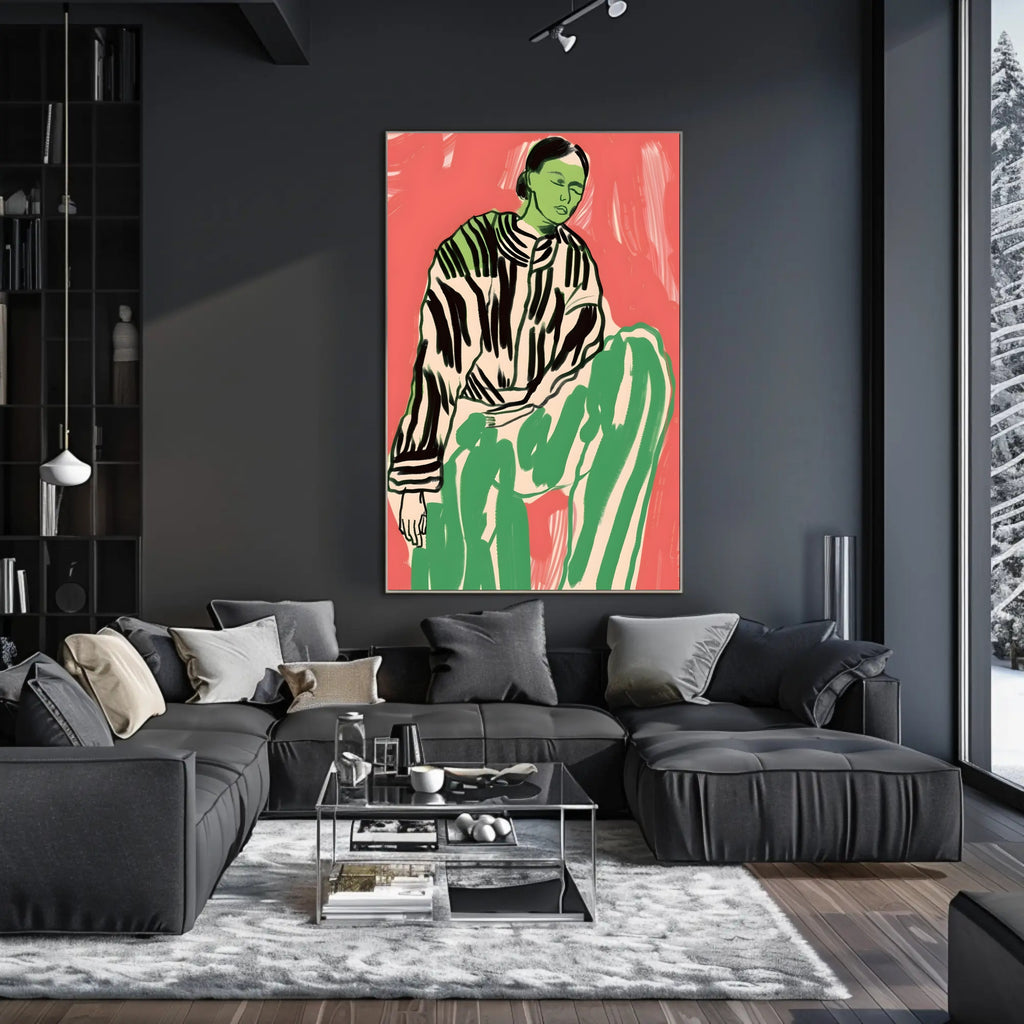Abstract Expression Poster from PosterGoat — a striking modern wall art print that blends bold brushstrokes and scenic inspiration into a statement poster for any room. Vibrant coral backgrounds, green sculptural shapes and black gestural lines form a contemplative figure that brings contemporary art energy and wanderlust charm to your walls.