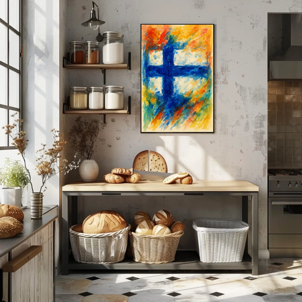 Designed to spark curiosity and elevate any space, this poster blends contemporary abstraction with the distinctive essence of the Finnish flag, creating a conversation-starting piece for your home, classroom, or office.