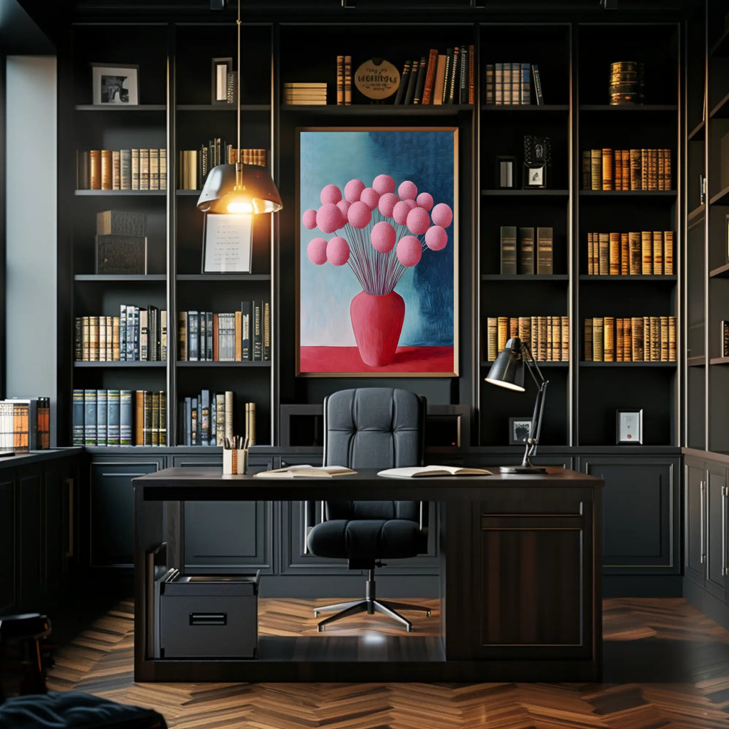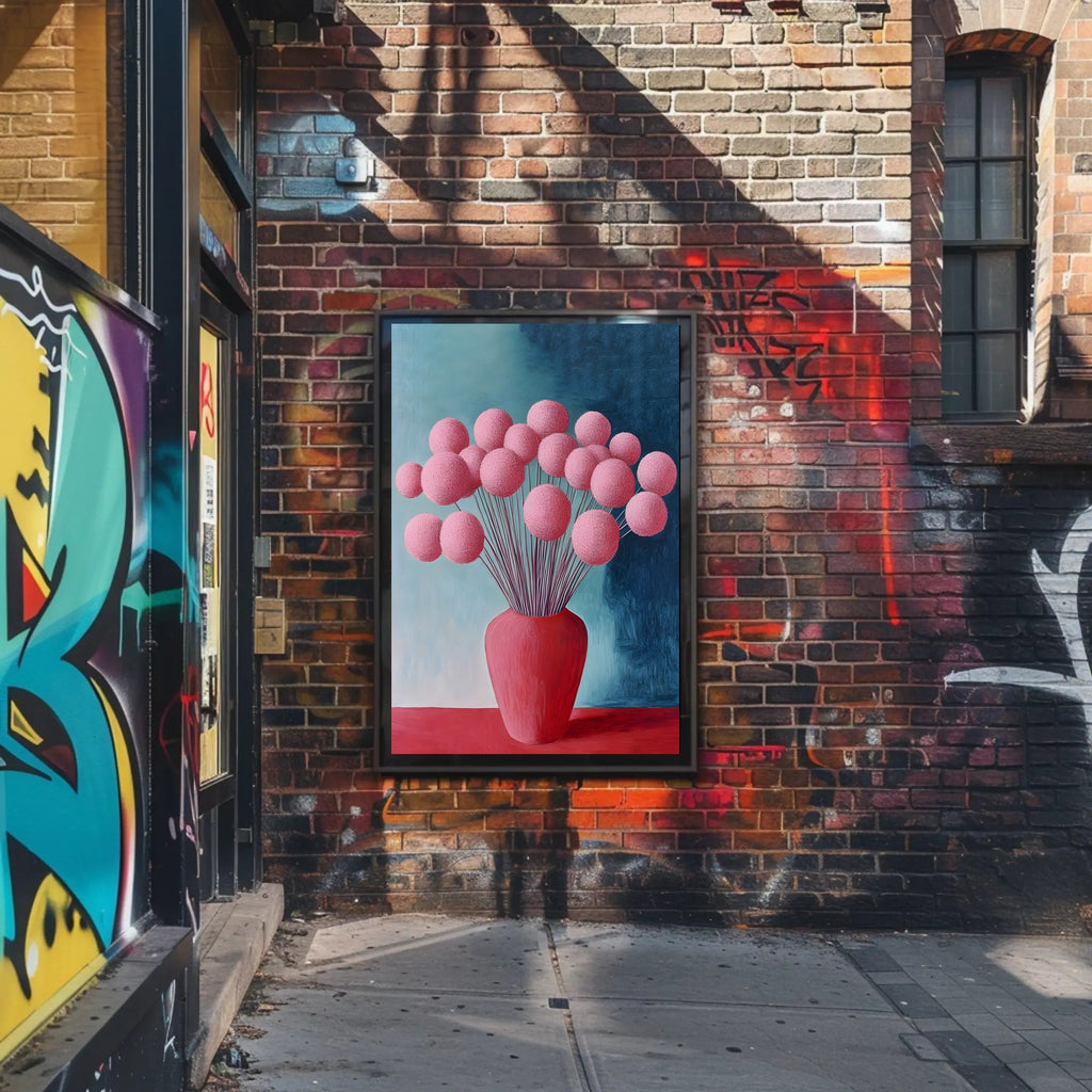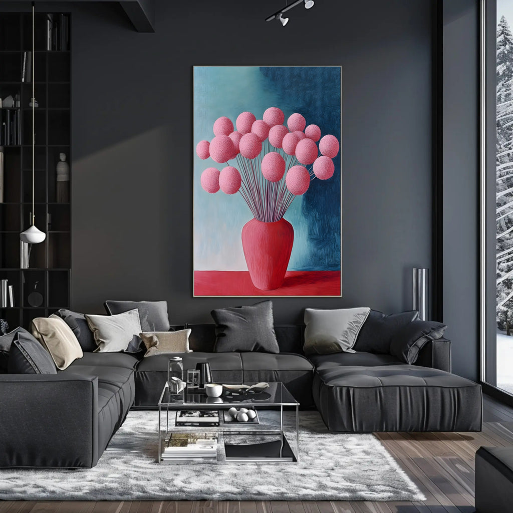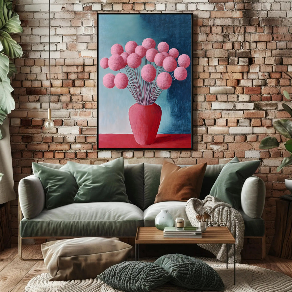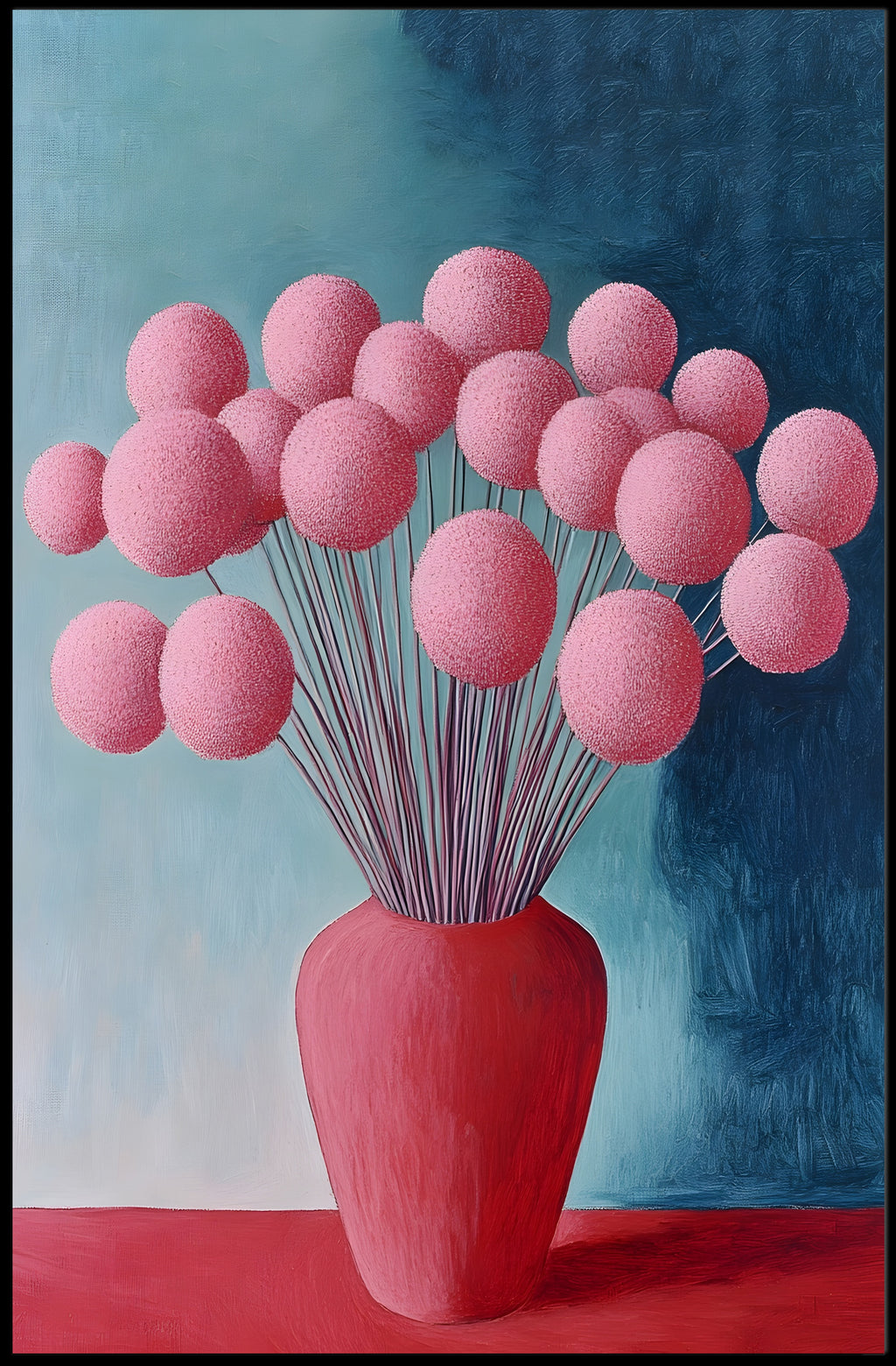 Bring a fresh, contemporary vibe to your space with the Abstract Floral Arrangement Poster from PosterGoat. This minimalist, art-forward print features textured, spherical pink blooms clustered above a bold red vase against a layered teal and navy background — a striking composition that reads as both floral and sculptural.