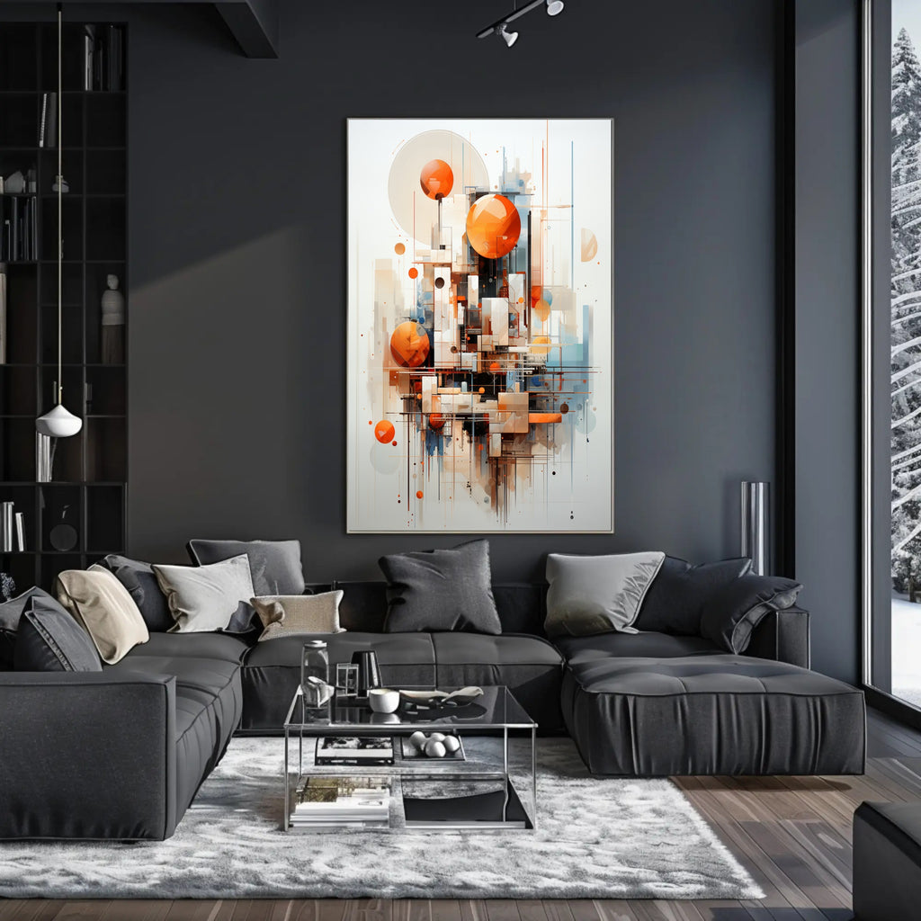 Vibrant accent palette: Warm orange orbs contrast with soft neutrals and cool blues for high-impact wall art that complements modern and mid-century interiors.