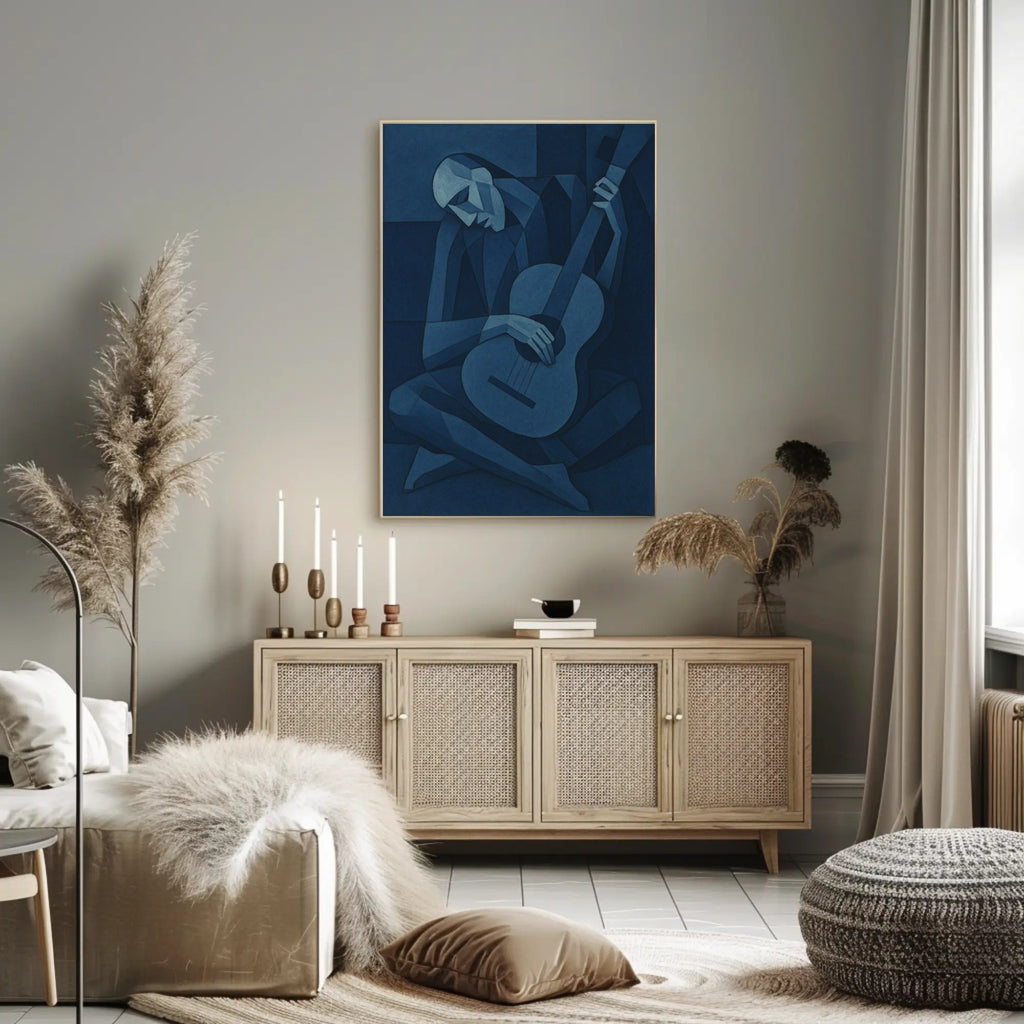 This captivating poster features an abstract representation of a guitar player, skillfully utilizing geometric shapes in homage to the Cubism art movement. The central figure, a musician, is depicted with bold, angular lines, creating a dynamic composition that captures the essence of musical introspection. Rendered in a rich monochromatic blue palette, the design evokes a somber yet reflective mood, inviting viewers to explore the depths of sound and emotion. Ideal for art enthusiasts and music lovers alike, this piece not only serves as a striking visual centerpiece but also celebrates the innovative spirit of abstract art.