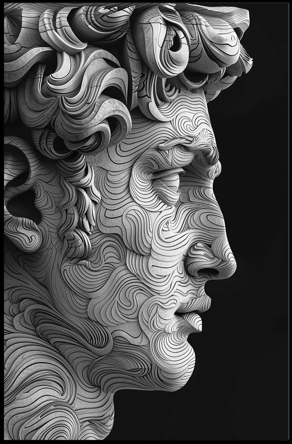 Detailed design highlighting the marble textures and the abstract portrait angle