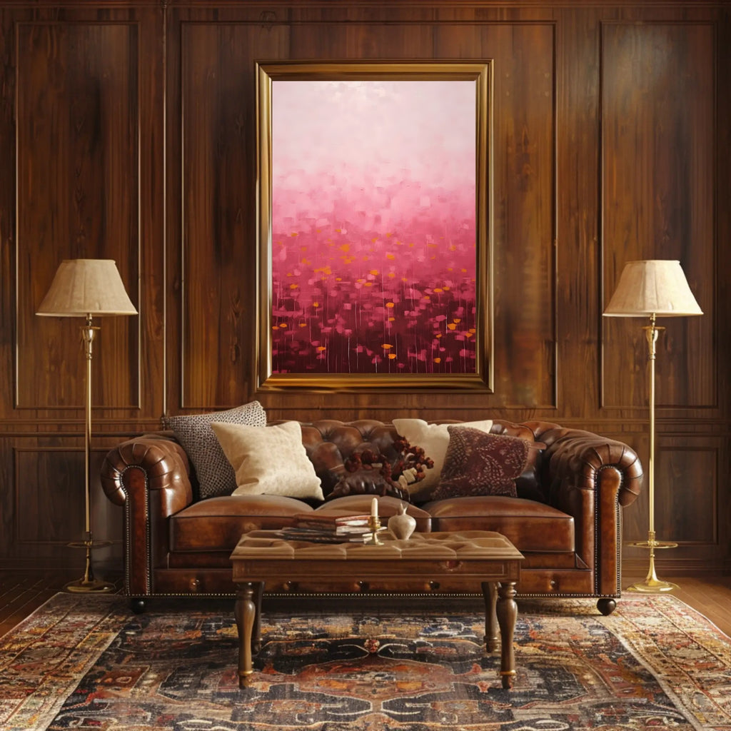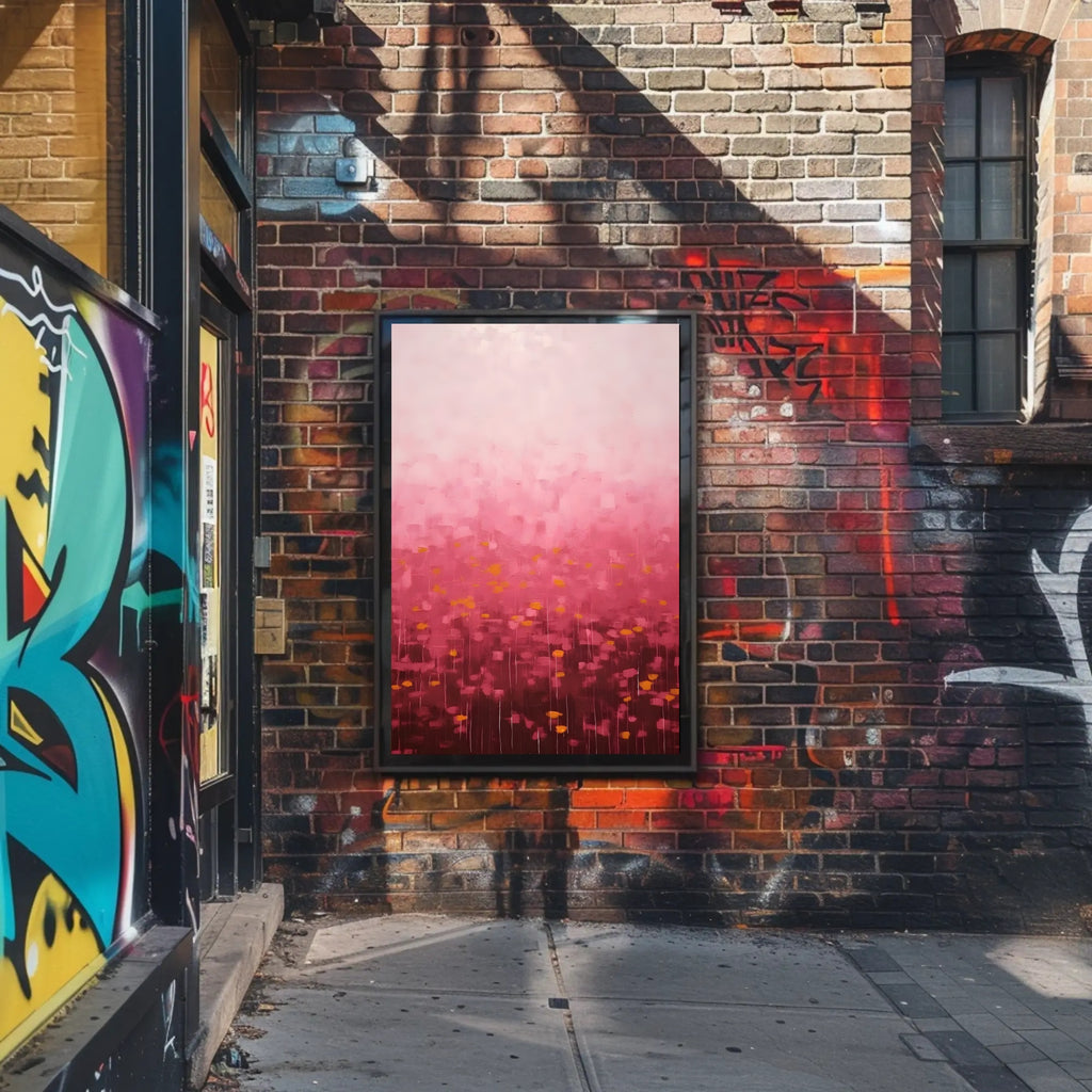 This modern art poster features a seamless gradient from blush to deep rose, layered with loose brush strokes, delicate vertical drips and warm golden accents that read like abstract flowers across a misty landscape. The composition balances serenity and movement, making it an ideal focal point for living rooms, bedrooms, nurseries, or office walls.