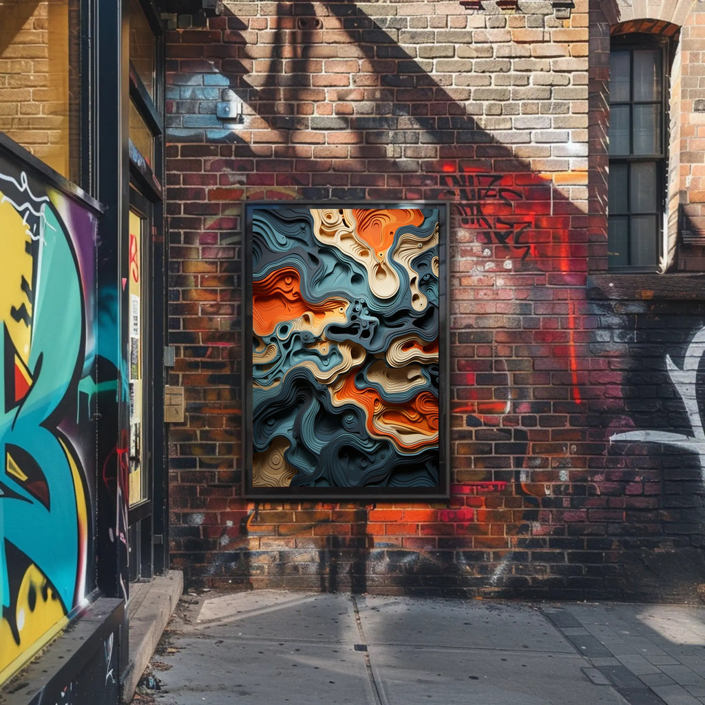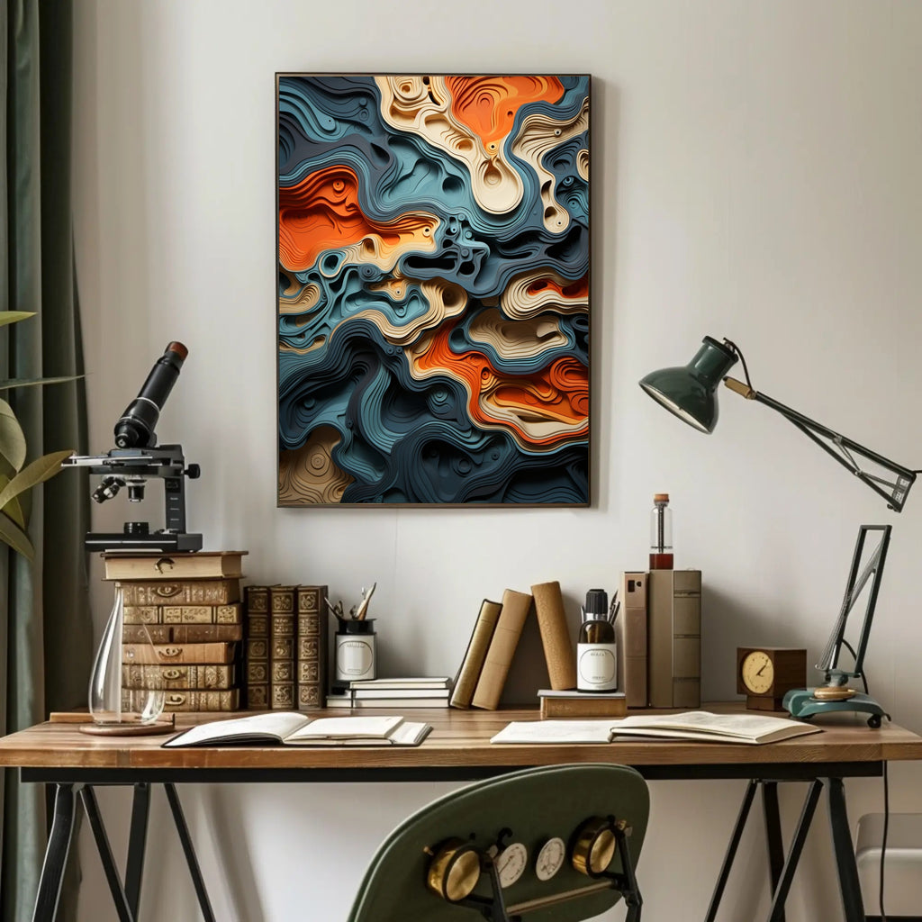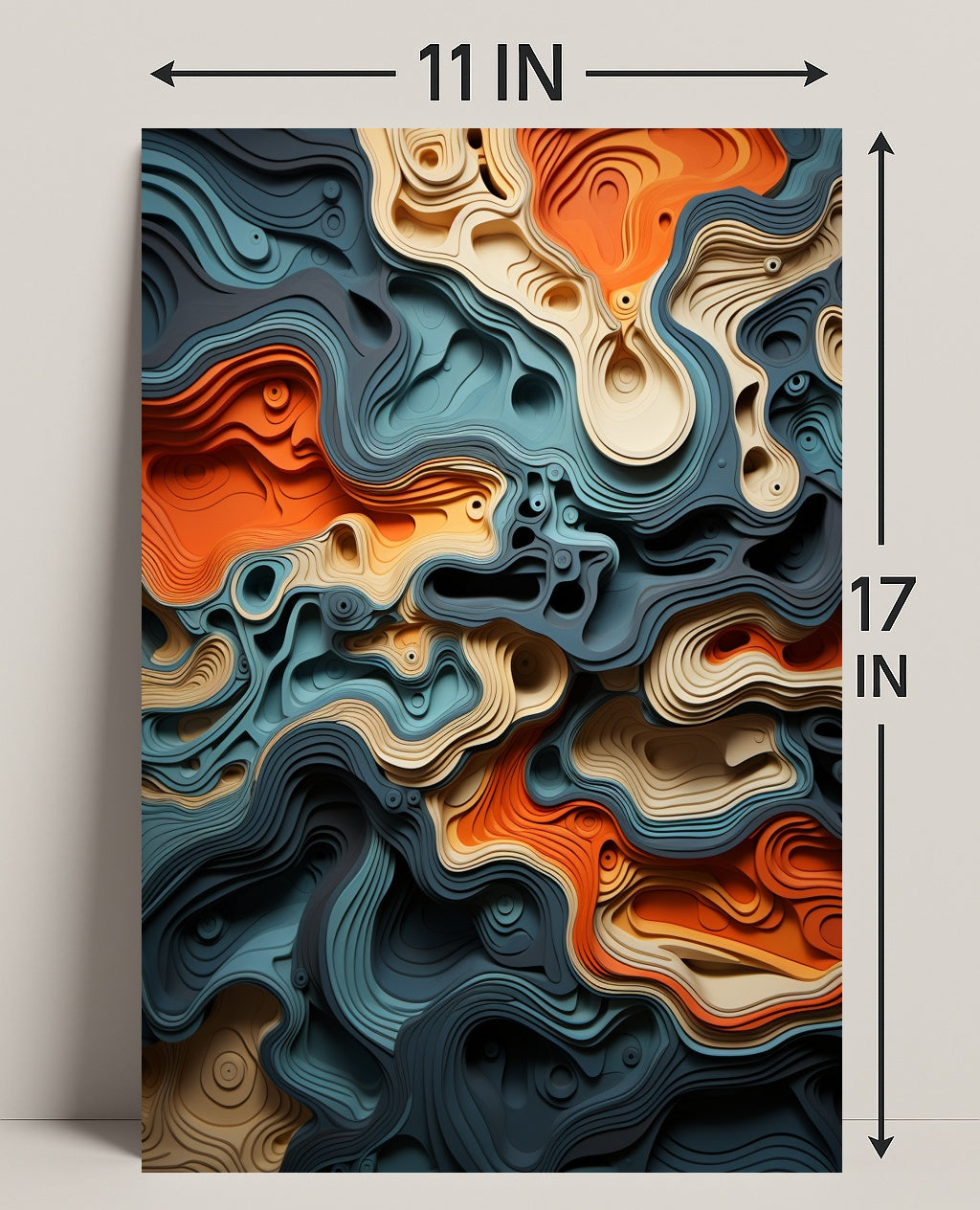 Abstract Topography Abstract Poster from PosterGoat transforms any room into a gallery-worthy focal point — a sculptural study of layered contours that brings the energy of landscapes indoors. Vibrant teal, warm orange and creamy neutrals unfold in paper-cut waves and deep recesses, creating a tactile illusion of depth that draws the eye and sparks conversation.