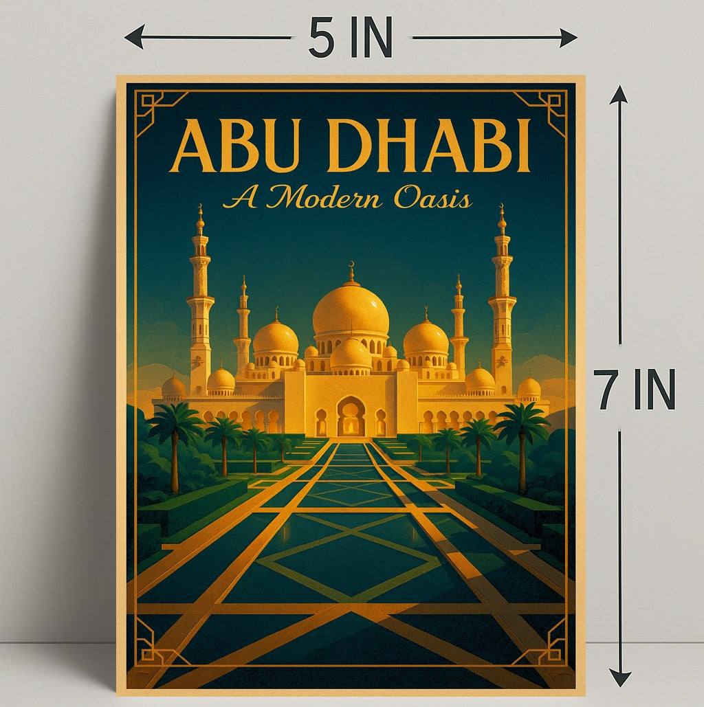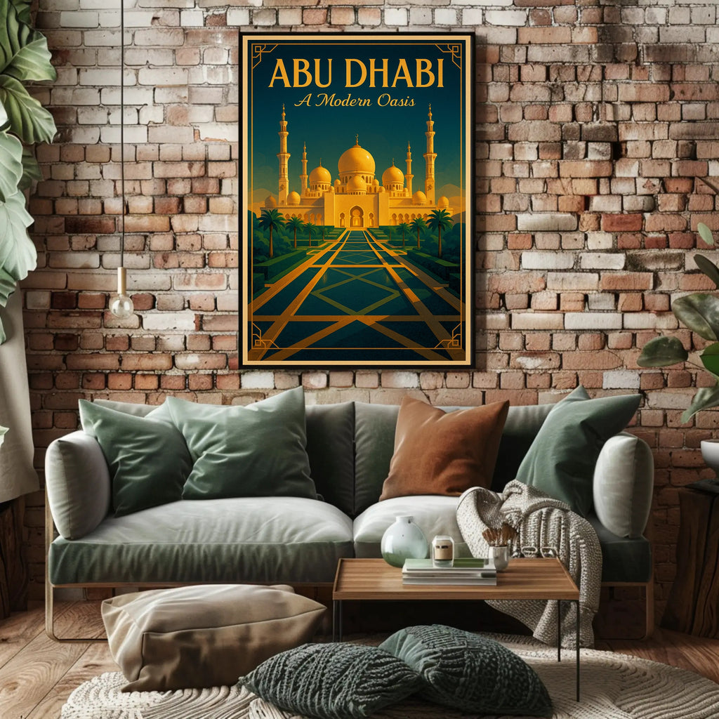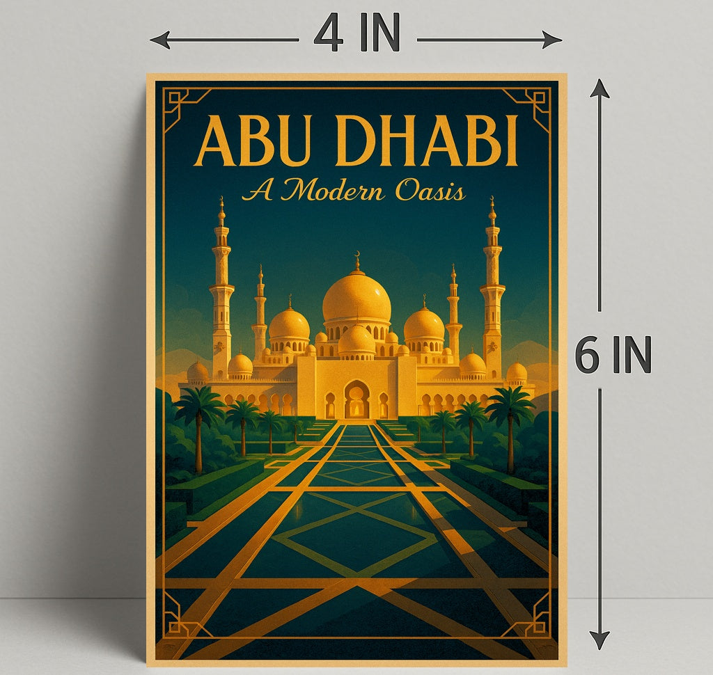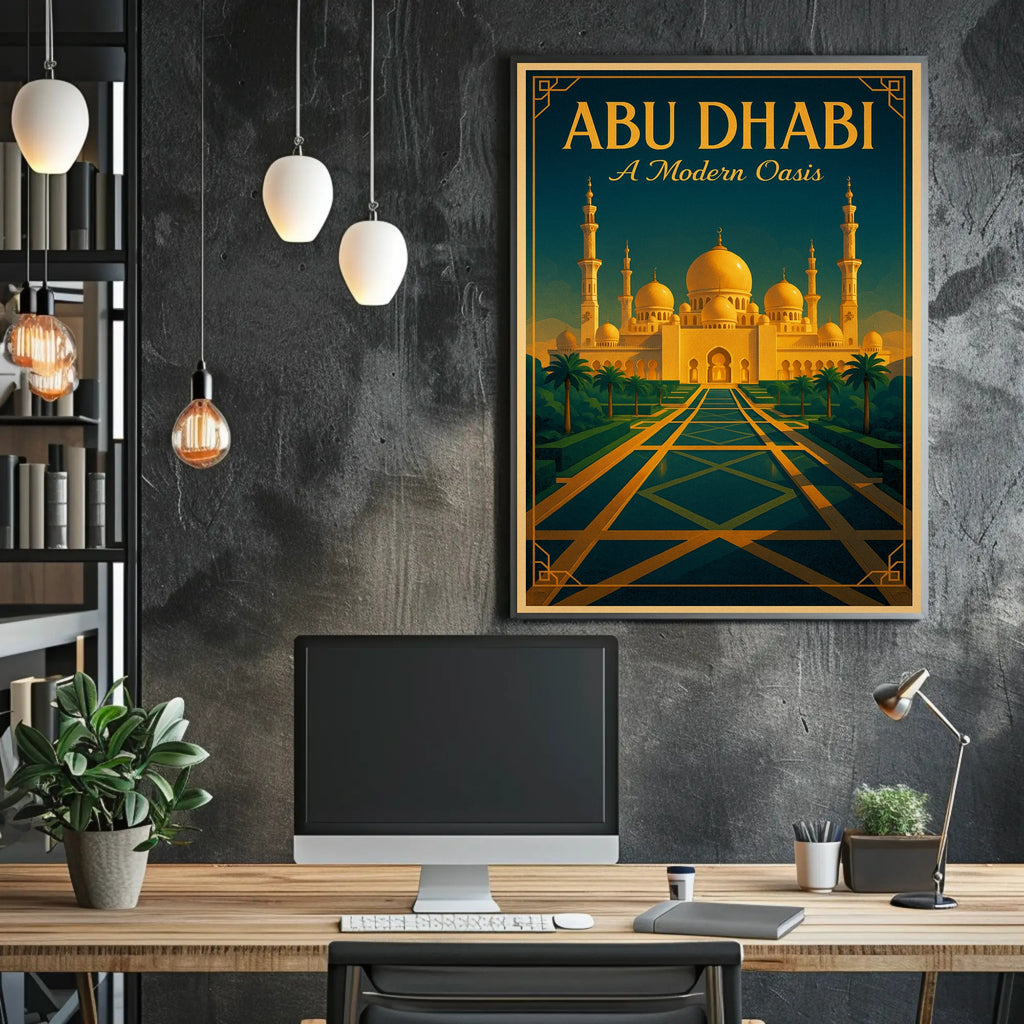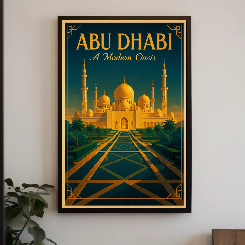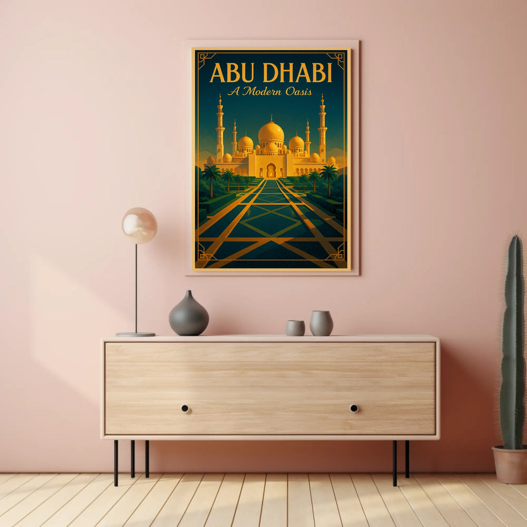 Elevate any room with the Abu Dhabi — A Modern Oasis Poster from PosterGoat, a striking travel print that blends architectural art and mid-century modern style into a timeless wall centerpiece.