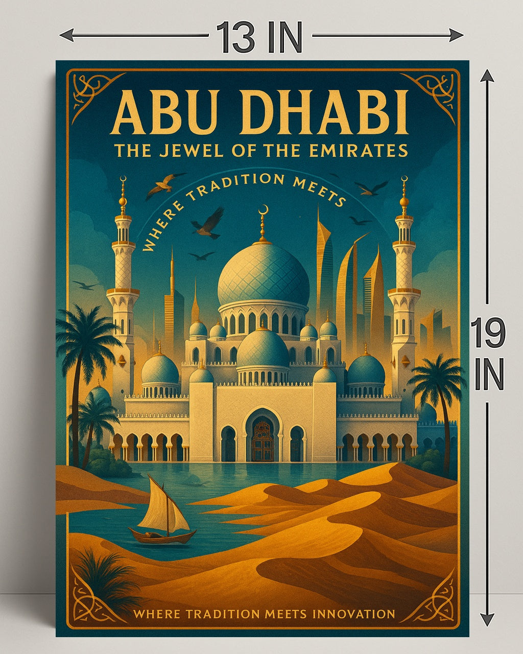 Abu Dhabi Elegance: Modern Meets Vintage Cultural or Heritage Poster by PosterGoat is a striking travel-style artwork that celebrates the city's dual spirit — where ornate Islamic architecture meets sleek modern skyline. This poster blends vintage illustration charm with a minimalist, contemporary color palette, featuring majestic domes and minarets framed against rising skyscrapers, golden desert dunes, and a traditional dhow gliding across tranquil water.