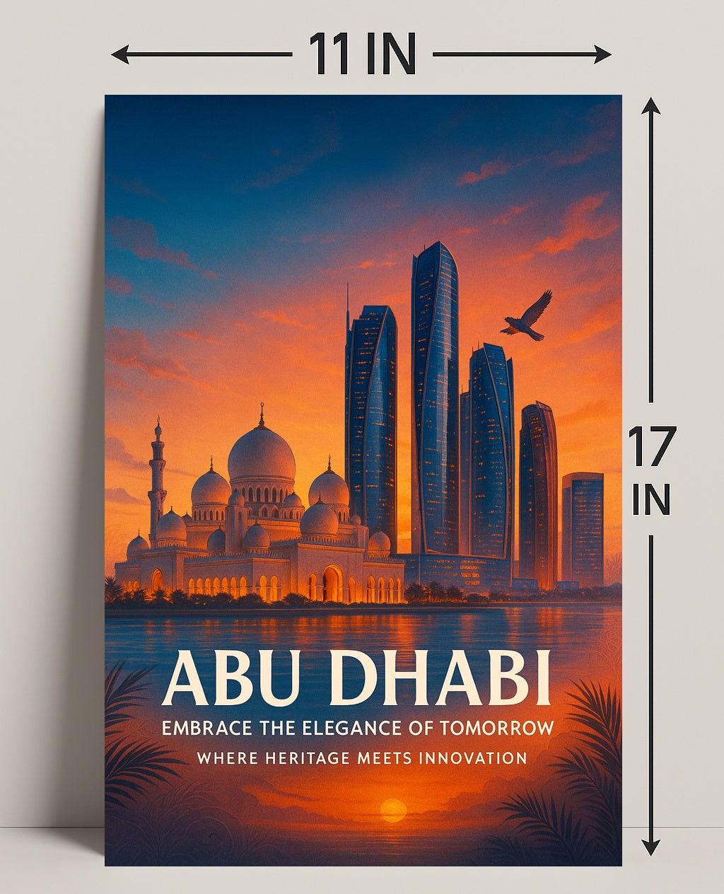 Capture the striking contrast of tradition and innovation with the Abu Dhabi Elegance Poster from PosterGoat — a minimalist yet richly detailed artwork that celebrates architectural harmony and cultural heritage. This dramatic cityscape illustration pairs the mosque's graceful domes and minarets with Abu Dhabi's soaring modern skyscrapers, all rendered in a warm sunset color palette that bathes the skyline in orange and deep indigo tones.
