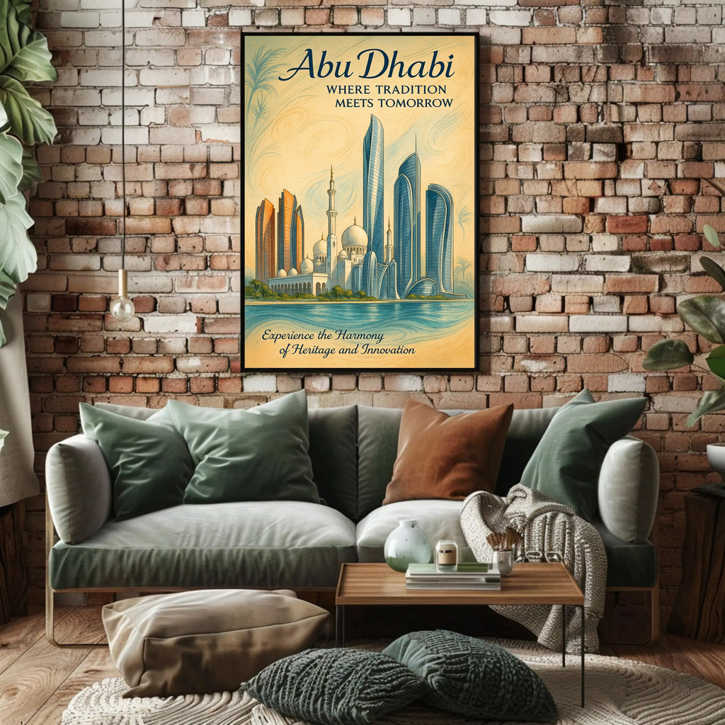 Immerse your space in the timeless contrast of heritage and innovation with the Abu Dhabi Elegance: Tradition Meets Tomorrow cityscape poster from PosterGoat. This modern-vintage illustration blends graceful mosque domes and slender minarets with sweeping, futuristic skyscrapers set against a stylized, swirling sky — a striking composition that celebrates Abu Dhabi’s architectural beauty and cultural richness.