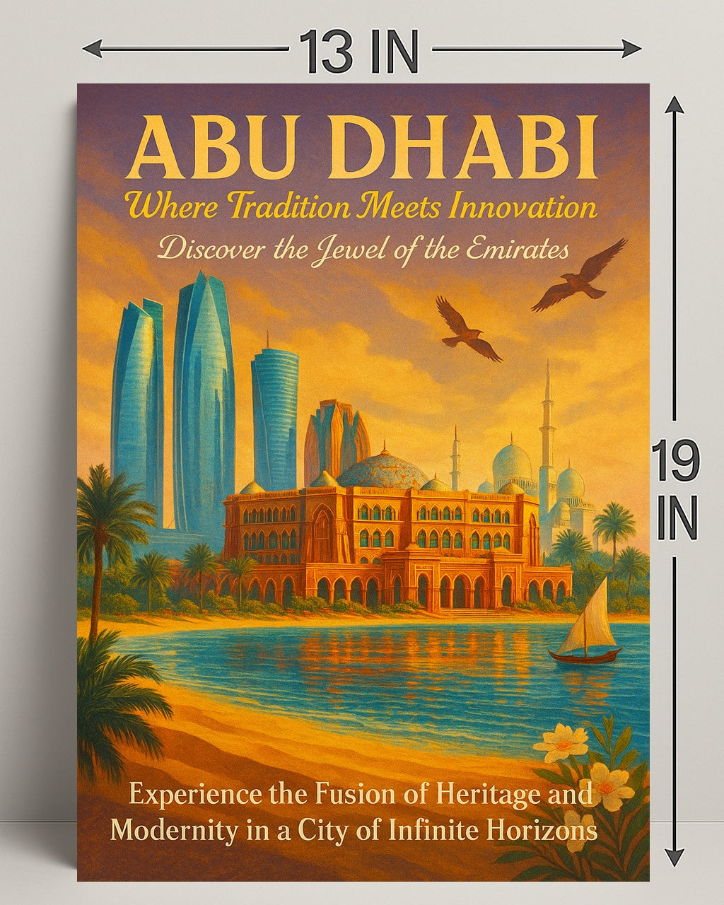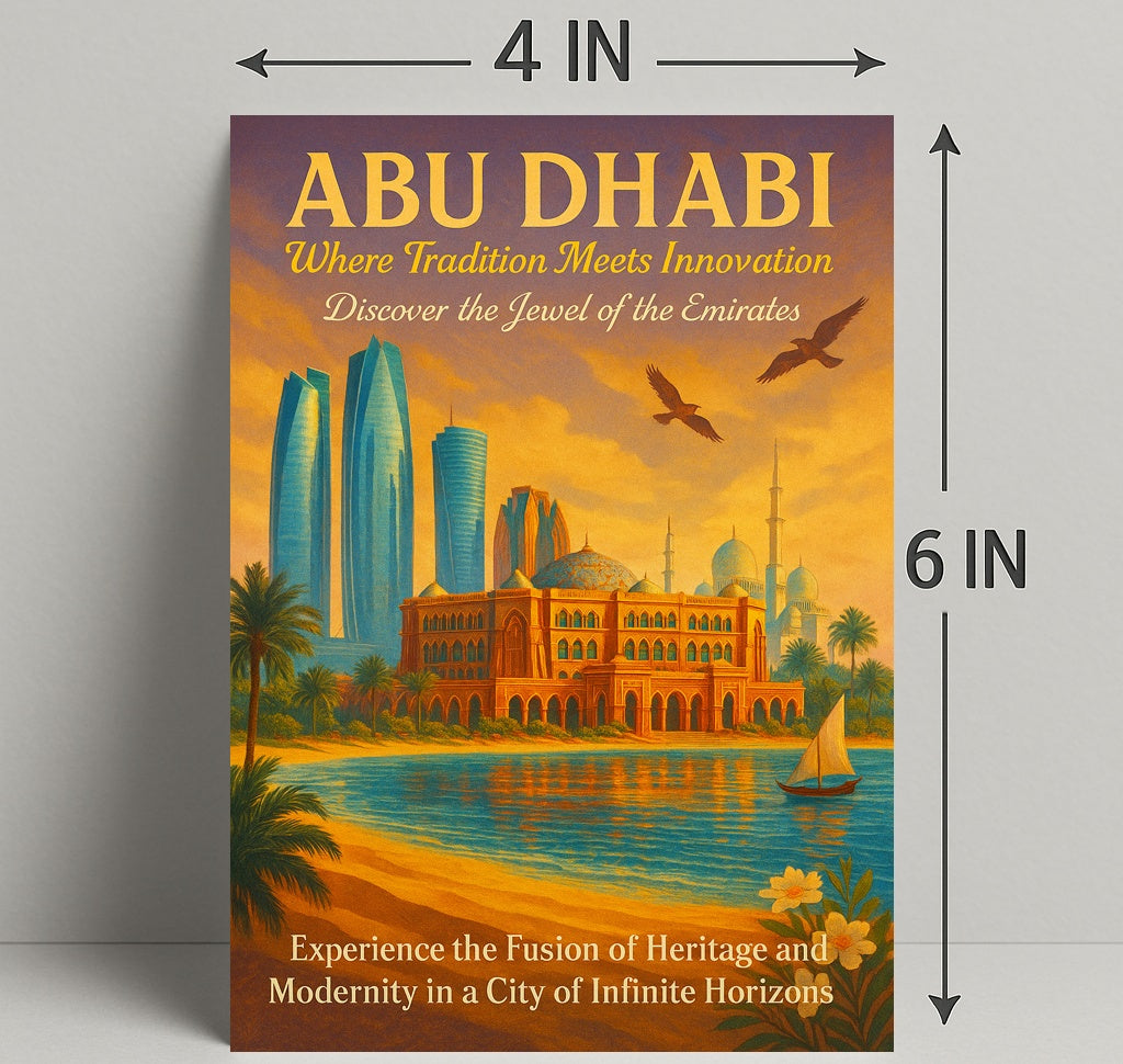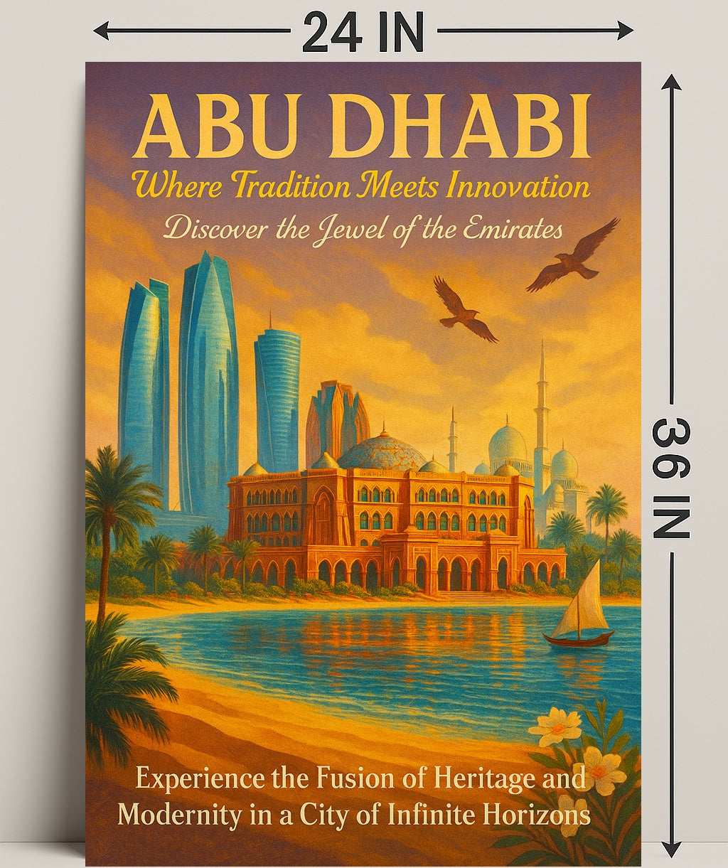 Abu Dhabi: Fusion of Tradition and Innovation Urban Poster by PosterGoat captures the iconic Abu Dhabi skyline in a warm golden-hour palette — modern glass skyscrapers rise behind elegant domes and ornate facades, palm-fringed shores reflect tranquil waters, and a lone dhow sails beneath circling birds. This photorealism-style poster celebrates the city's blend of traditional architecture and cutting-edge design, perfect for travel lovers, architecture fans, and anyone who treasures cultural heritage art.