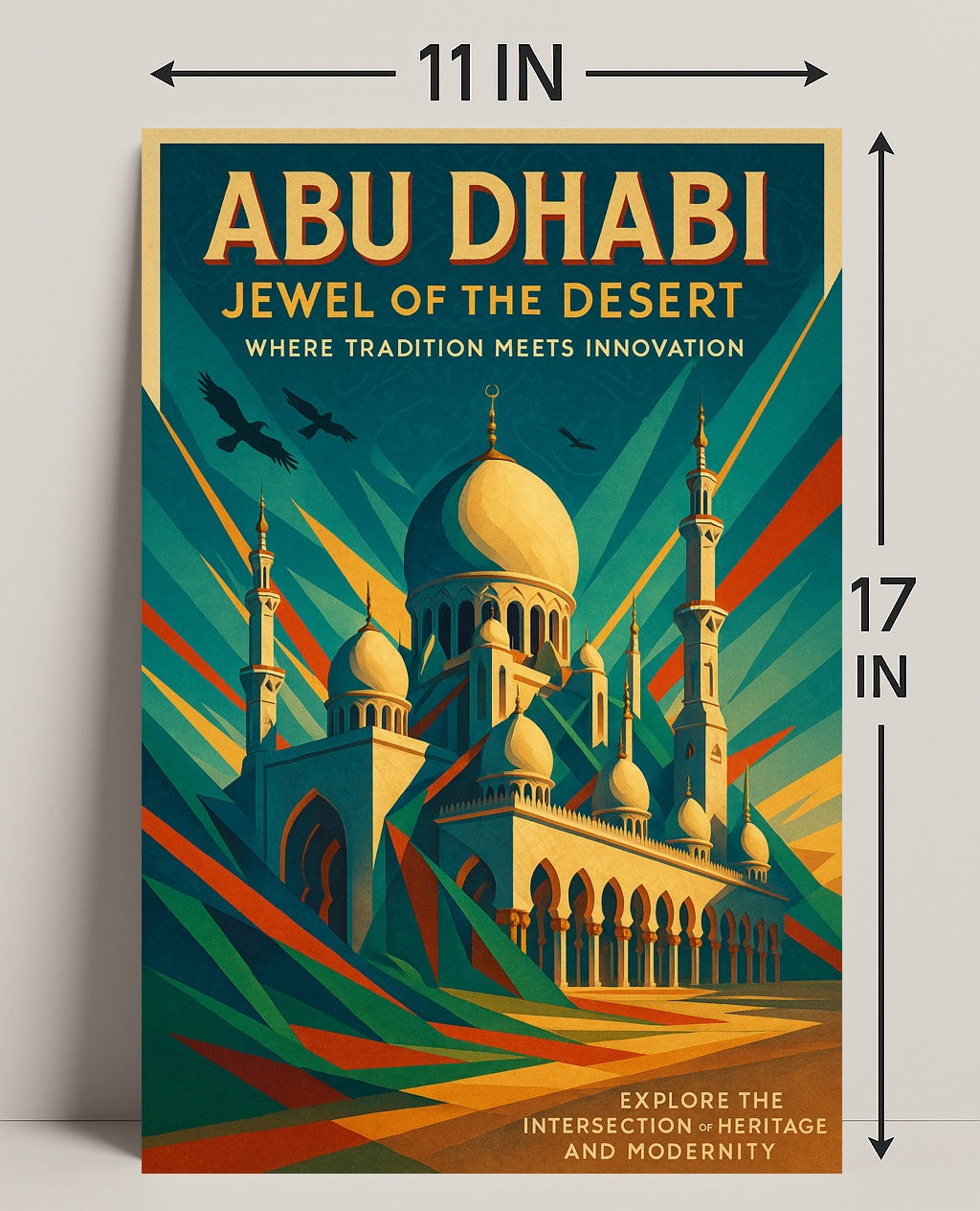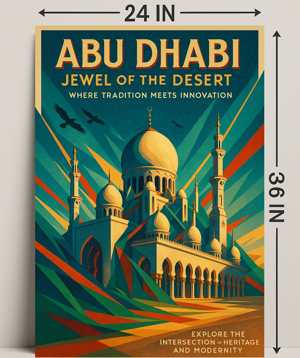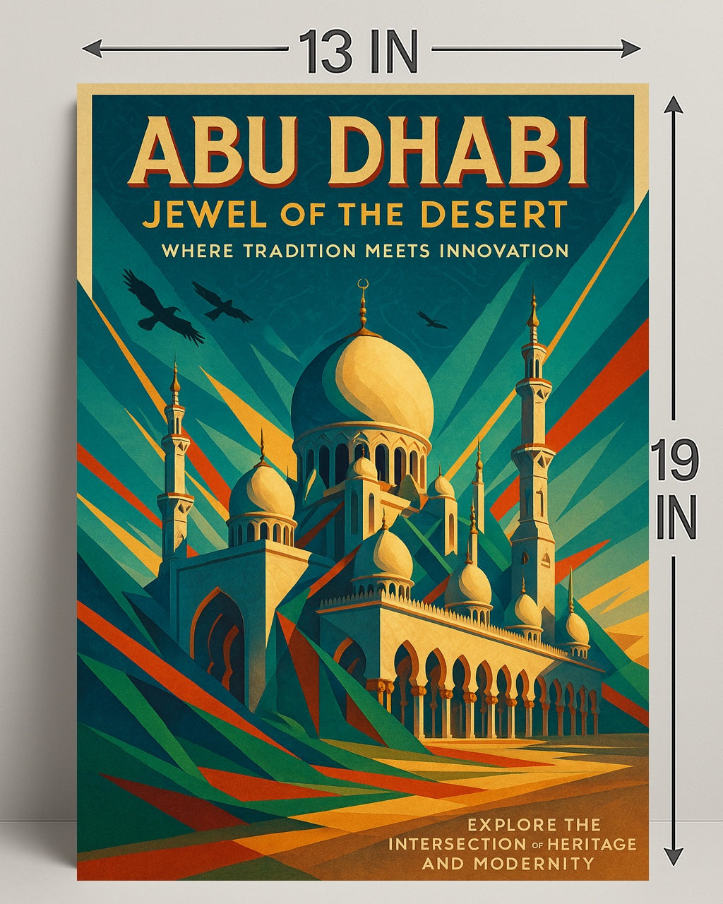 Immerse yourself in the grandeur of Abu Dhabi with the stunning "Jewel of the Desert" travel poster by PosterGoat. This vibrant piece captures the essence of the city, showcasing a magnificent mosque that reflects the iconic architecture defining Abu Dhabi’s skyline. The dynamic design, enhanced by soaring birds and geometric patterns, brings a touch of sophistication to any space.