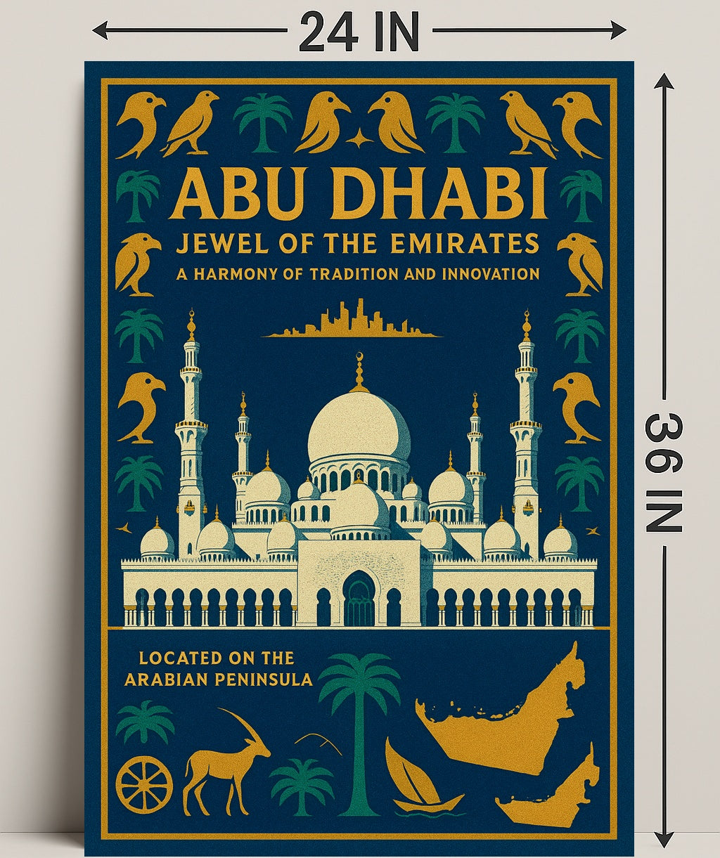 Abu Dhabi — Jewel of the Emirates captures the grandeur of Abu Dhabi in a single, striking poster from PosterGoat. Rendered in deep navy with rich gold accents, this travel-inspired art print showcases an elegant depiction of the Sheikh Zayed-style domes and minarets, framed by palm motifs, falcons and a stylized map of the emirate — a timeless tribute to tradition and innovation.