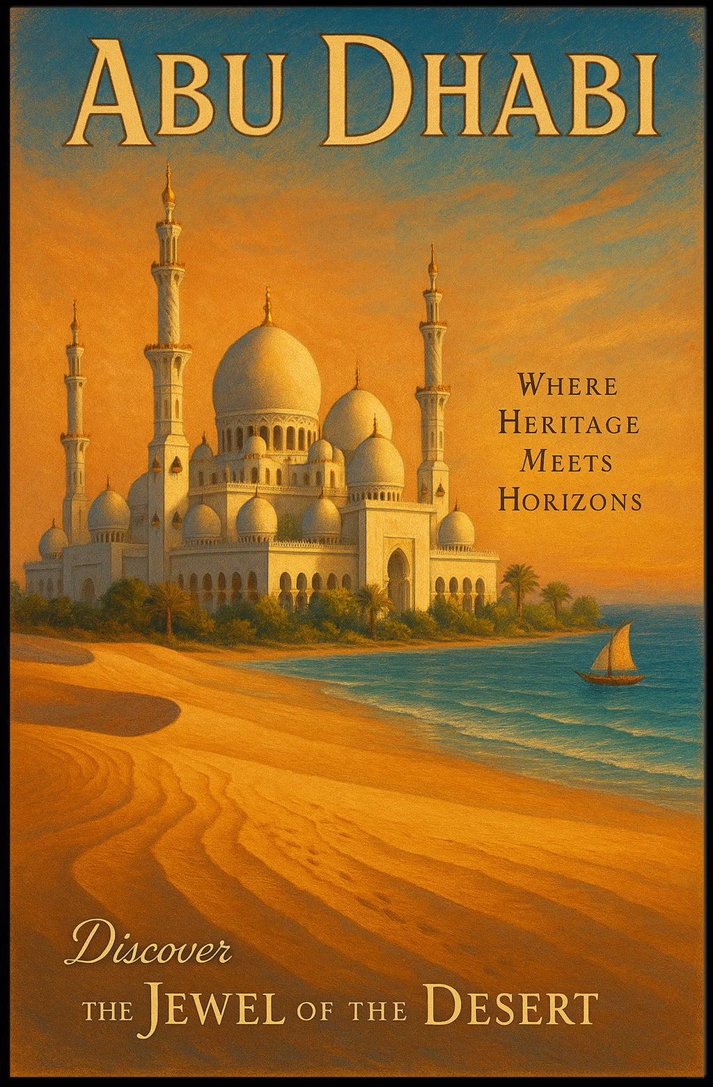 Bring home a piece of the UAE's charm—hang it where guests can admire the intricate architecture and soothing seaside scene. Order your PosterGoat Abu Dhabi travel poster today and transform your space with a timeless travel classic.