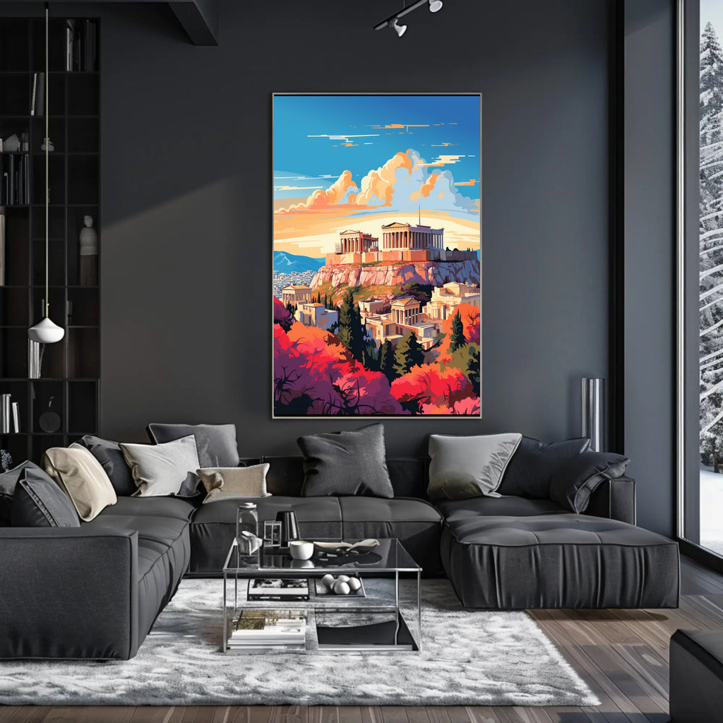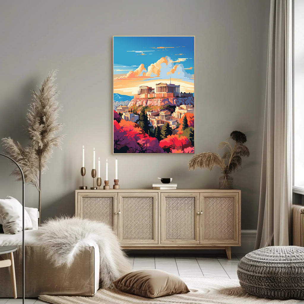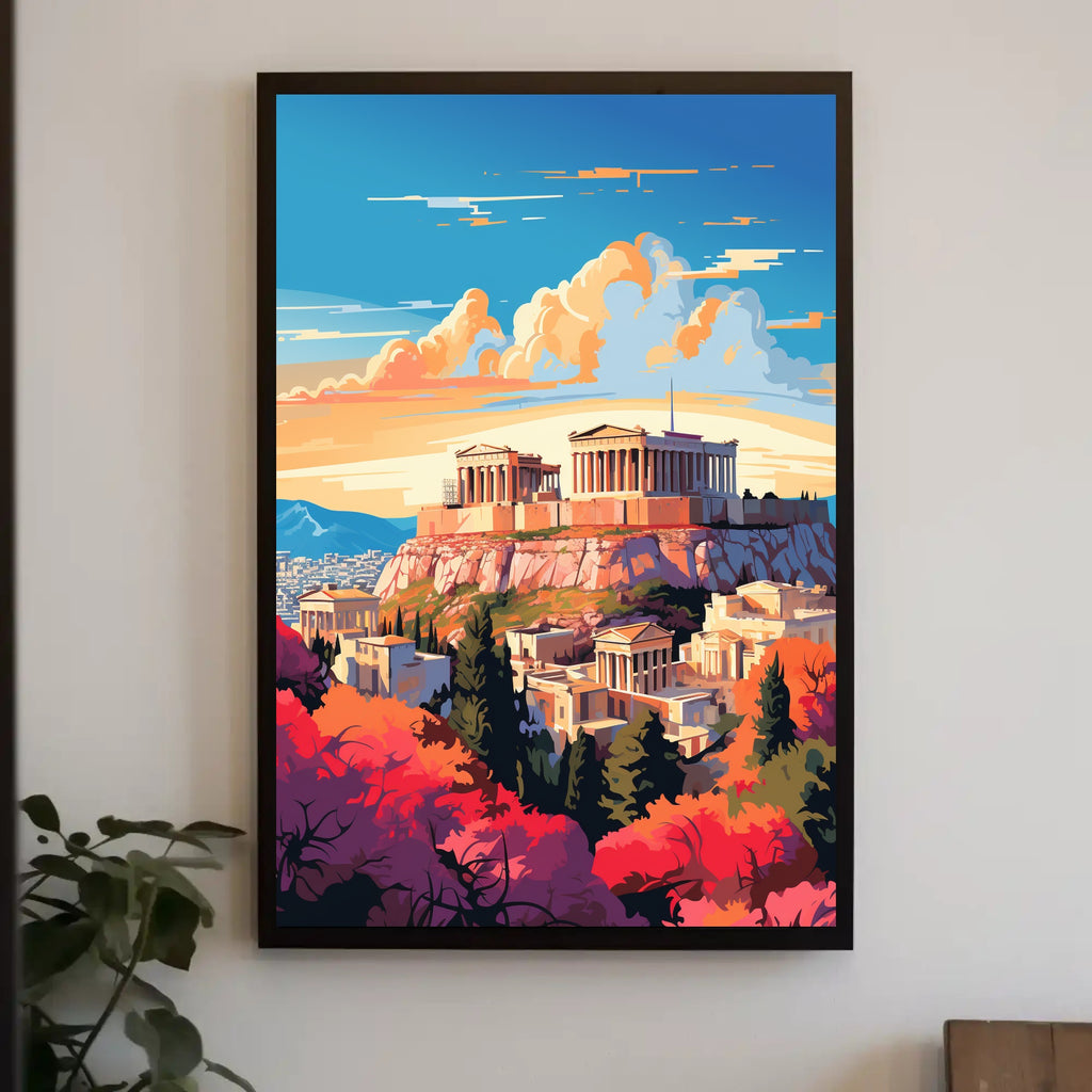 Bring the majesty of Ancient Greece into your home with the Acropolis Athens Scenic Art Print by PosterGoat. This striking cultural poster reimagines the Acropolis and Parthenon in a vivid, vector-style illustration—rich blues meet warm oranges and vibrant pink foliage to create a dramatic, travel-inspired focal point for any room.