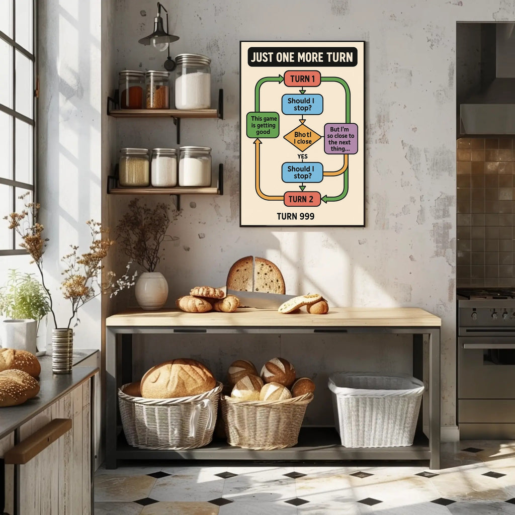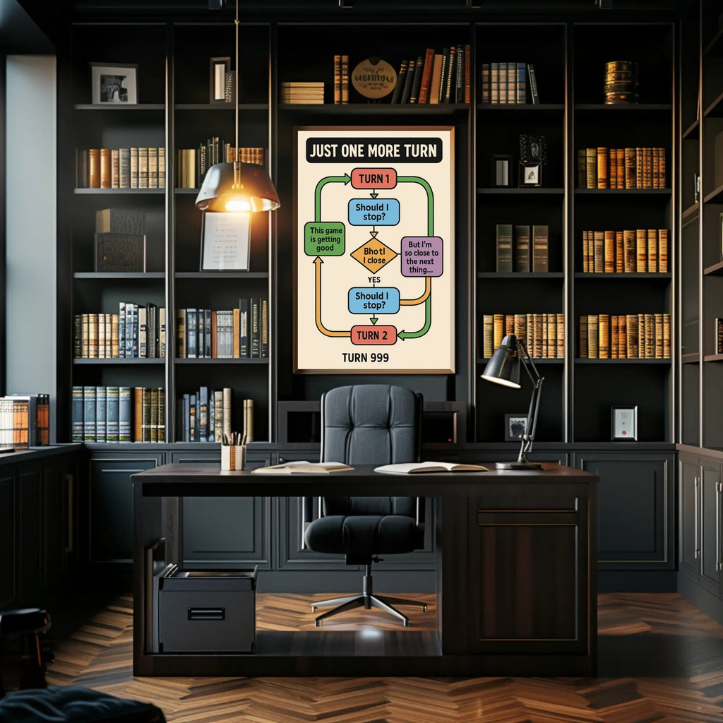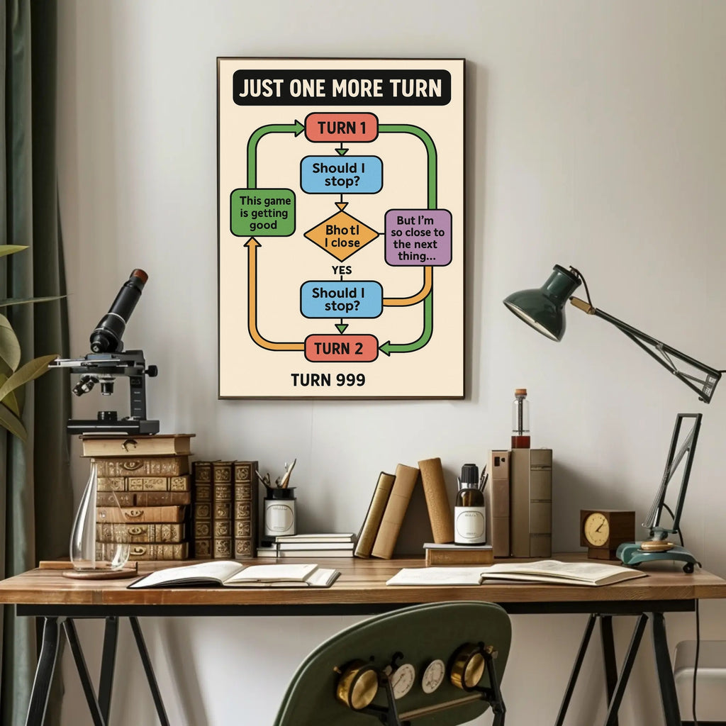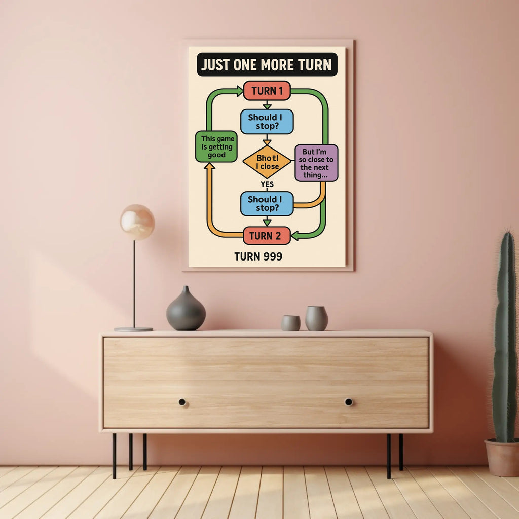Celebrate the irresistible pull of turn-based games with the Addictive Gaming Cycle Flowchart Pop Culture Poster from PosterGoat — a witty, pop-art print that turns a player's eternal "just one more turn" dilemma into vibrant wall art.