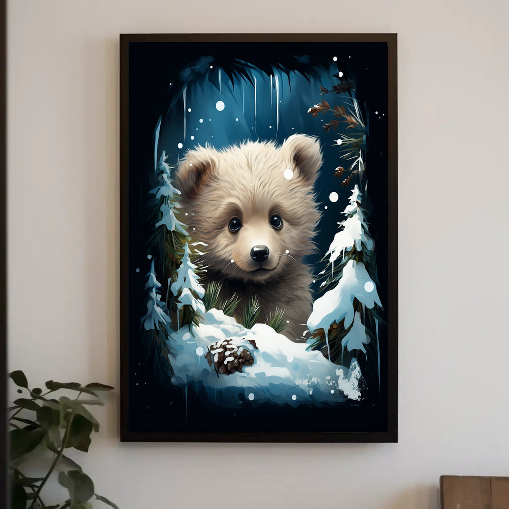 Presenting the Adorable Bear Cub in Winter Forest Poster, a timeless wall art piece that brings the tenderness of nature into any space. This enchanting poster features a charming bear cub nestled in a serene winter forest. The photorealistic illustration captures the cub's expressive eyes and fluffy fur, set against a backdrop of snow-laden pine branches and shimmering icicles. The cool blues and whites evoke a peaceful, heartwarming atmosphere, perfect for adding a touch of nature's innocence and wonder to your home.