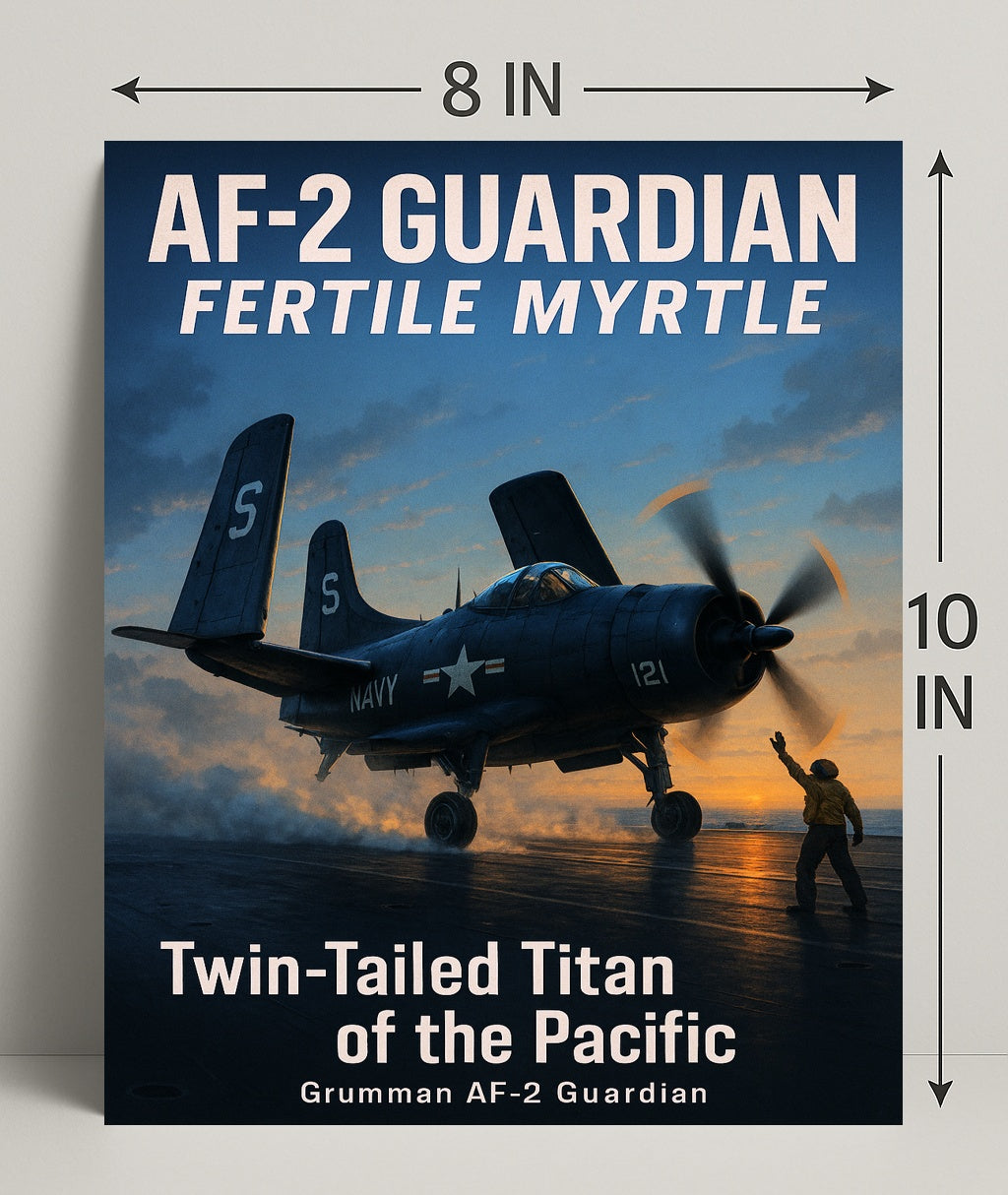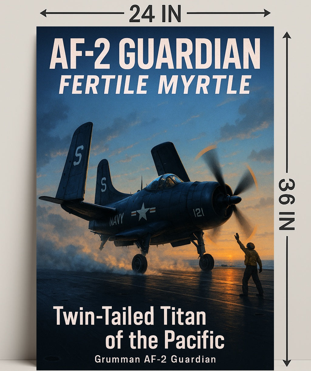 Capture the drama of naval aviation with the AF-2 Guardian Twin-Tailed Titan of the Pacific Poster from PosterGoat — a high-quality art print that brings vintage aviation charm and cinematic sunset lighting to any wall. This striking poster features the iconic Grumman AF-2 Guardian on a carrier deck at dusk: twin tails silhouetted against a deepening sky, a spinning propeller throwing warm rim light, and a lone deckhand signaling beneath steam and reflective flight-deck sheen.