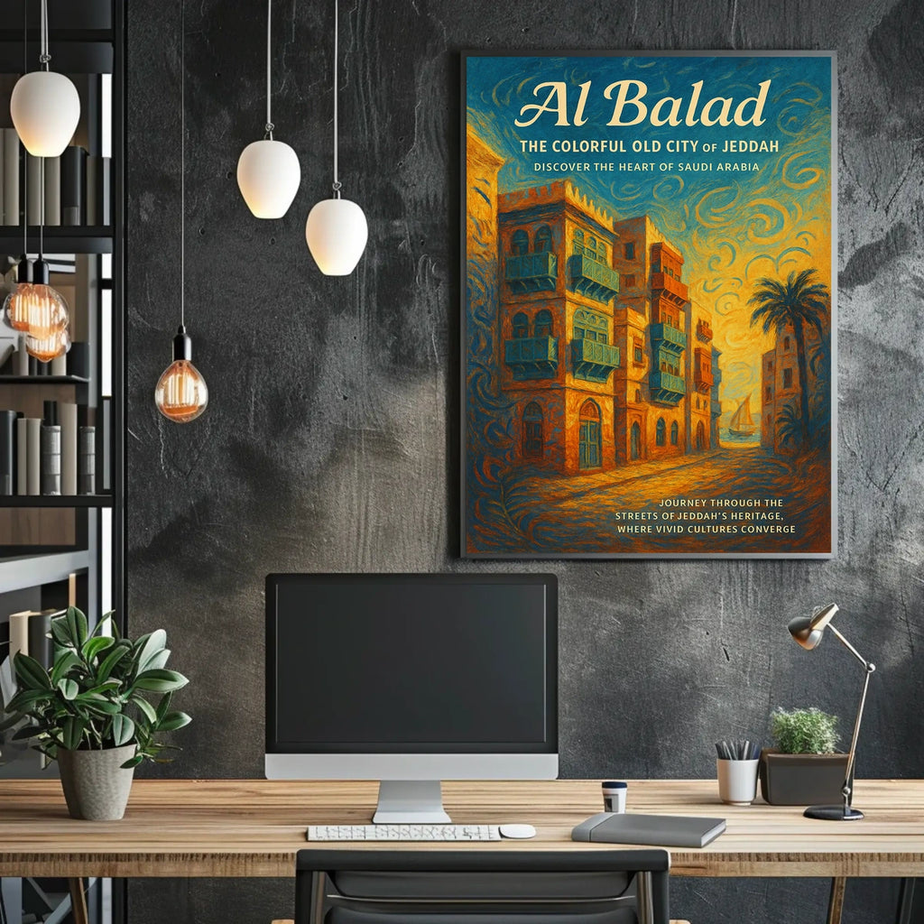 Intro: Celebrate the charm of Al Balad with this Colorful Old City poster. Inspired by Jeddah's historic lanes, this art print blends rich textures, radiant hues, and a timeless sense of wanderlust to elevate any living space.