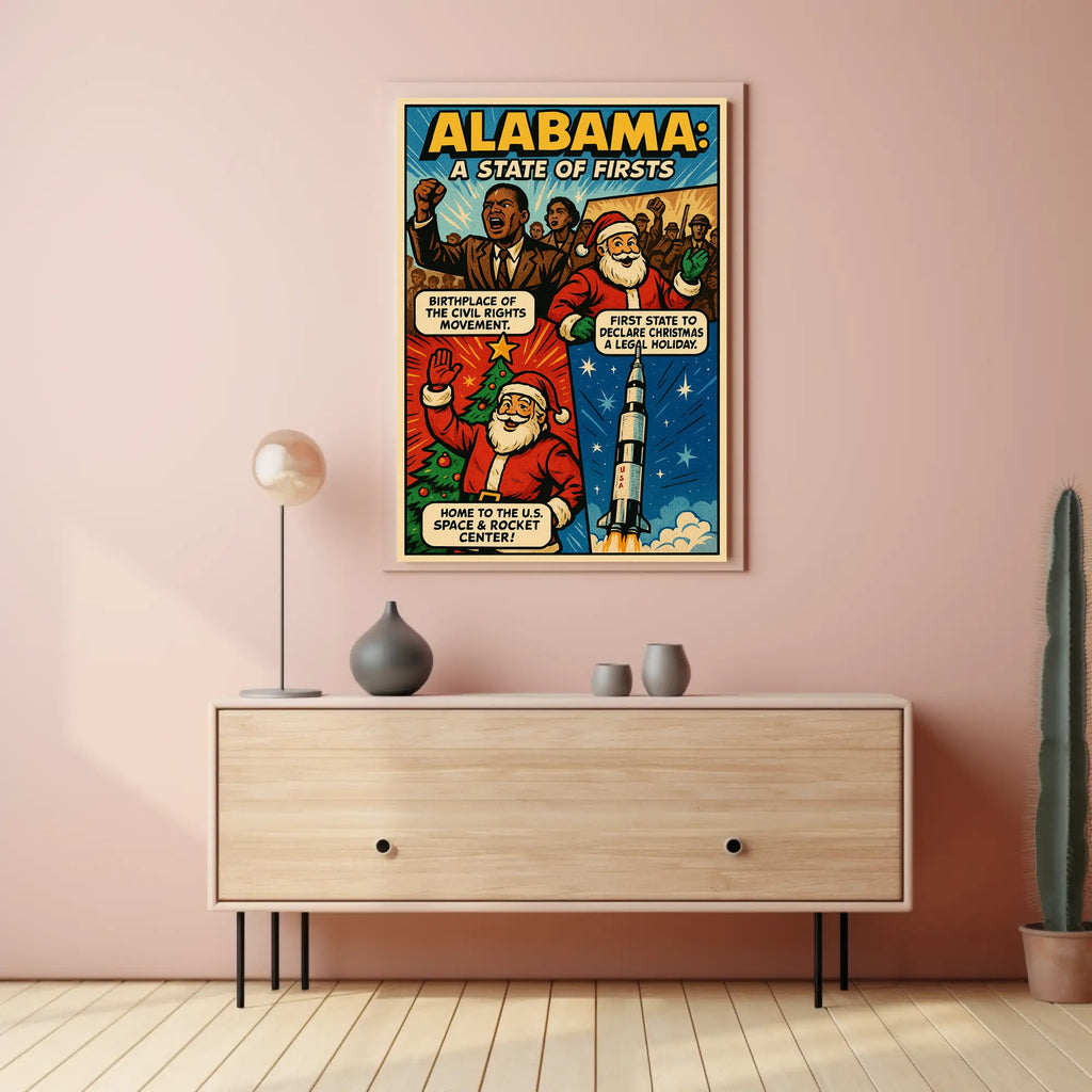 Alabama: A State of Firsts Poster by PosterGoat brings a spirited, vintage comic‑style celebration of Alabama's proud milestones to your wall. Bold typography, vibrant retro colors and lively illustrations — from civil rights rallies to Santa and a launching rocket — make this scenic poster a conversation‑starting piece for any home, office or travel‑themed gallery.