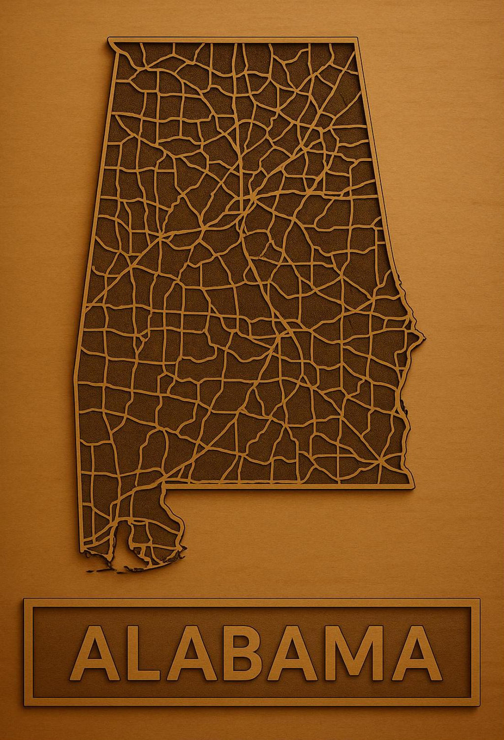 Alabama State Map Artistry Abstract Poster by PosterGoat brings a refined, mid-century modern touch to any wall with its minimalist, map-inspired design. Warm brown tones and a sophisticated embossed effect create a tactile visual that celebrates Alabama's outline while doubling as contemporary artwork for living rooms, offices, or educational spaces.