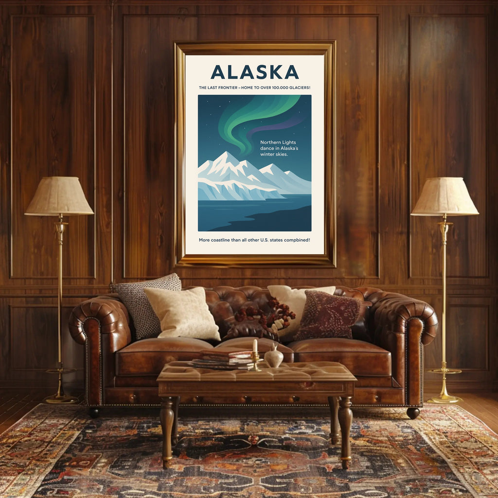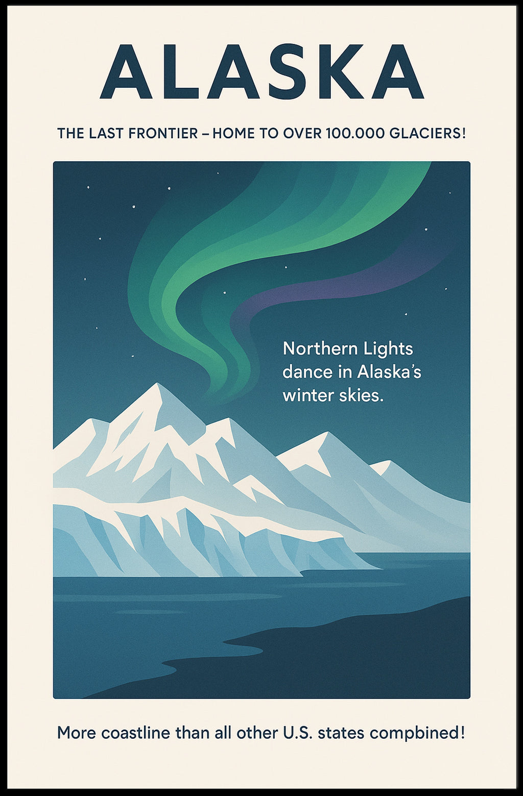 - Themes: Alaska, Frontier, Scenic; Styles: Minimalist; Poster subtheme: Northern Lights, Mountain Print, Ethereal Landscape.
