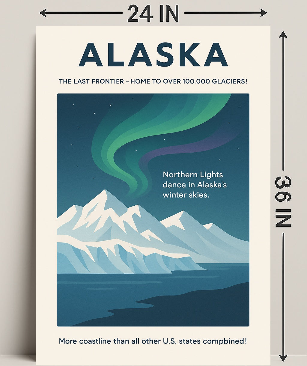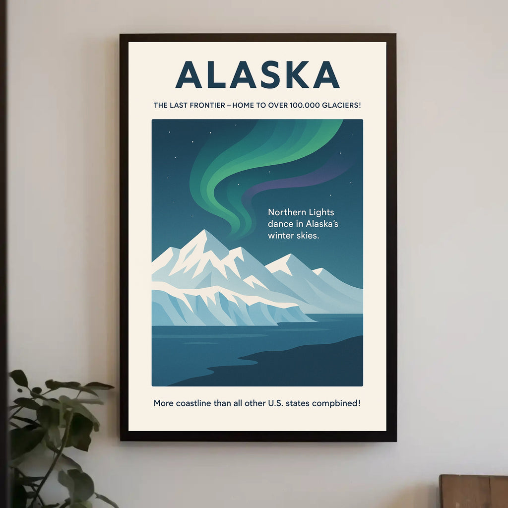 Alaska The Last Frontier Poster — Bring the serene grandeur of Alaska into your home with this PosterGoat art print. A minimalist, travel-inspired poster that captures crisp snow-capped mountains, deep coastal waters and the swooping green-and-teal Northern Lights against a star-speckled sky. The bold cream border and large "ALASKA" header give it a classic vintage-poster look that works beautifully in modern interiors.
