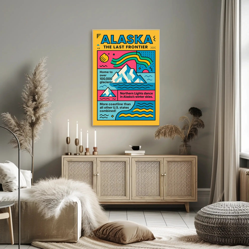 Bring the wild beauty of the Last Frontier into your home with the Alaska: The Last Frontier Poster by PosterGoat. This vibrant, graphic-print poster blends retro pop colors with crisp, minimalist lines — an eye-catching statement piece for living rooms, offices, cabins, or travel-inspired galleries.