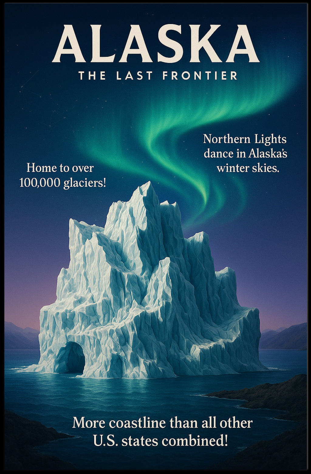 Travel-inspired charm: Evokes the spirit of exploration and Alaska’s unique facts (glaciers, coastline, northern lights) for wanderlust lovers and collectors of vintage-style prints.